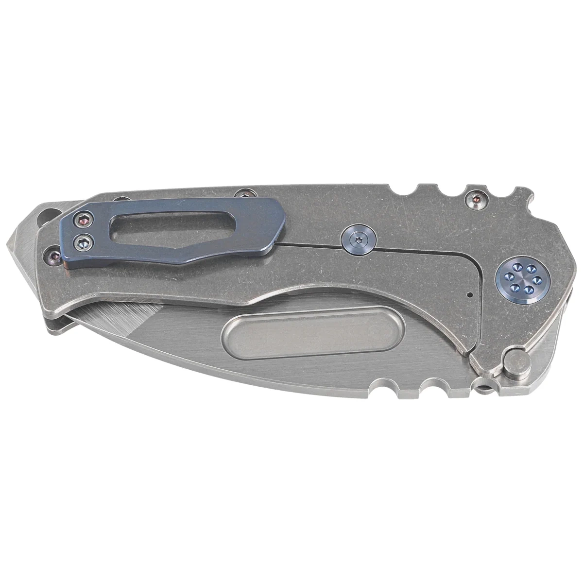 The elite Imperial Praetorian Guard was a unit into which the best of the Roman legionaries were selected to serve as the Emperor's personal protection. The Praetorian T Tanto Gray Titanium, Blue HW/Clip, NP3 Breaker, Tumbled from MKT is just such an elite knife. Its amazing design is limited only by the strength of its materials. With a 4.8mm thick blade, solid 3.2mm thick titanium grips and 6.35mm thick pivots and screws, it stands out from other knives. The hollow grind on the blade has been crafted by hand - a rarity in the knife industry, achieved by only a select few manufacturers capable of executing such precision.