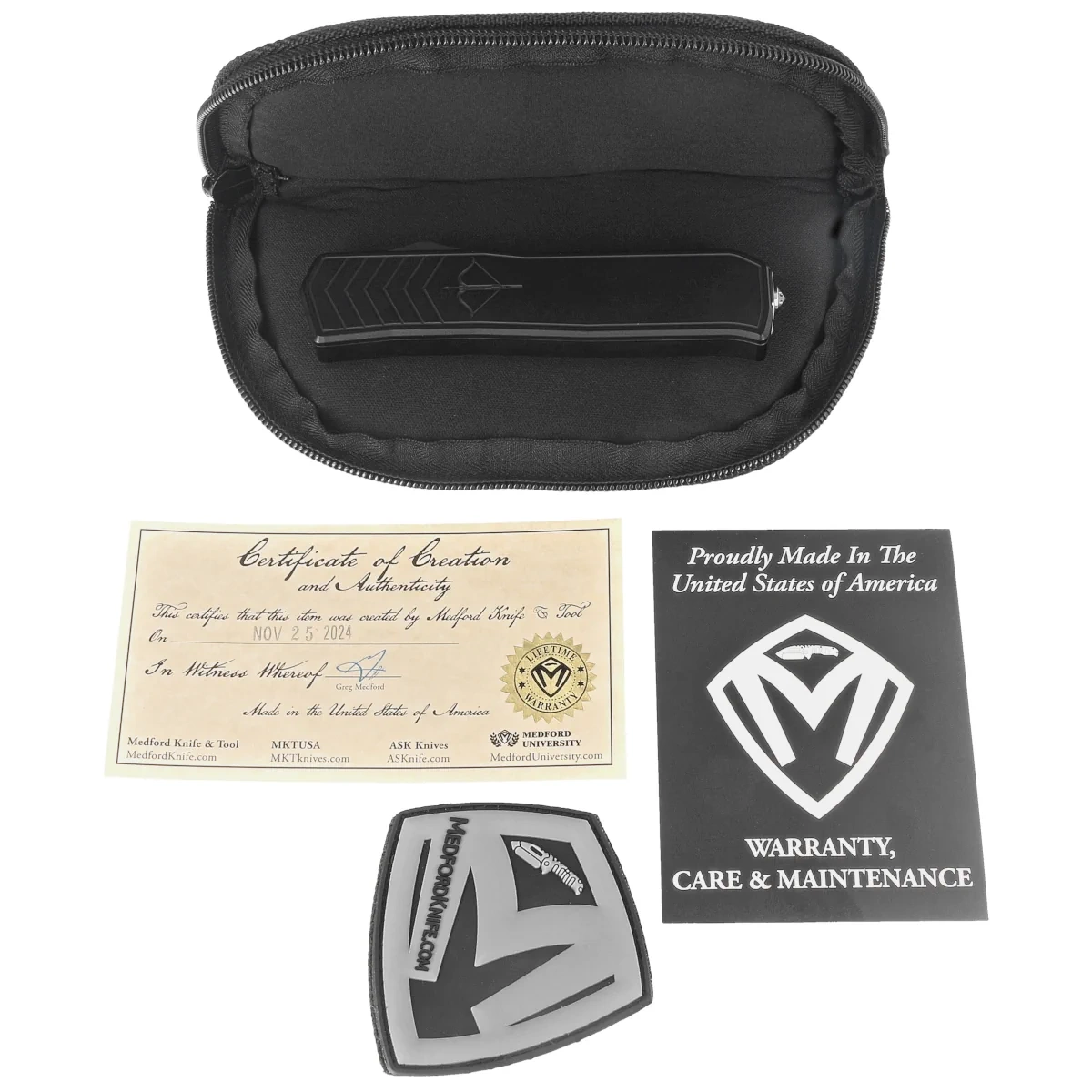 Included - cardboard packaging, nylon pouch, company patch with Velcro attachment and signed “Certificate of Creation and Authenticity”.