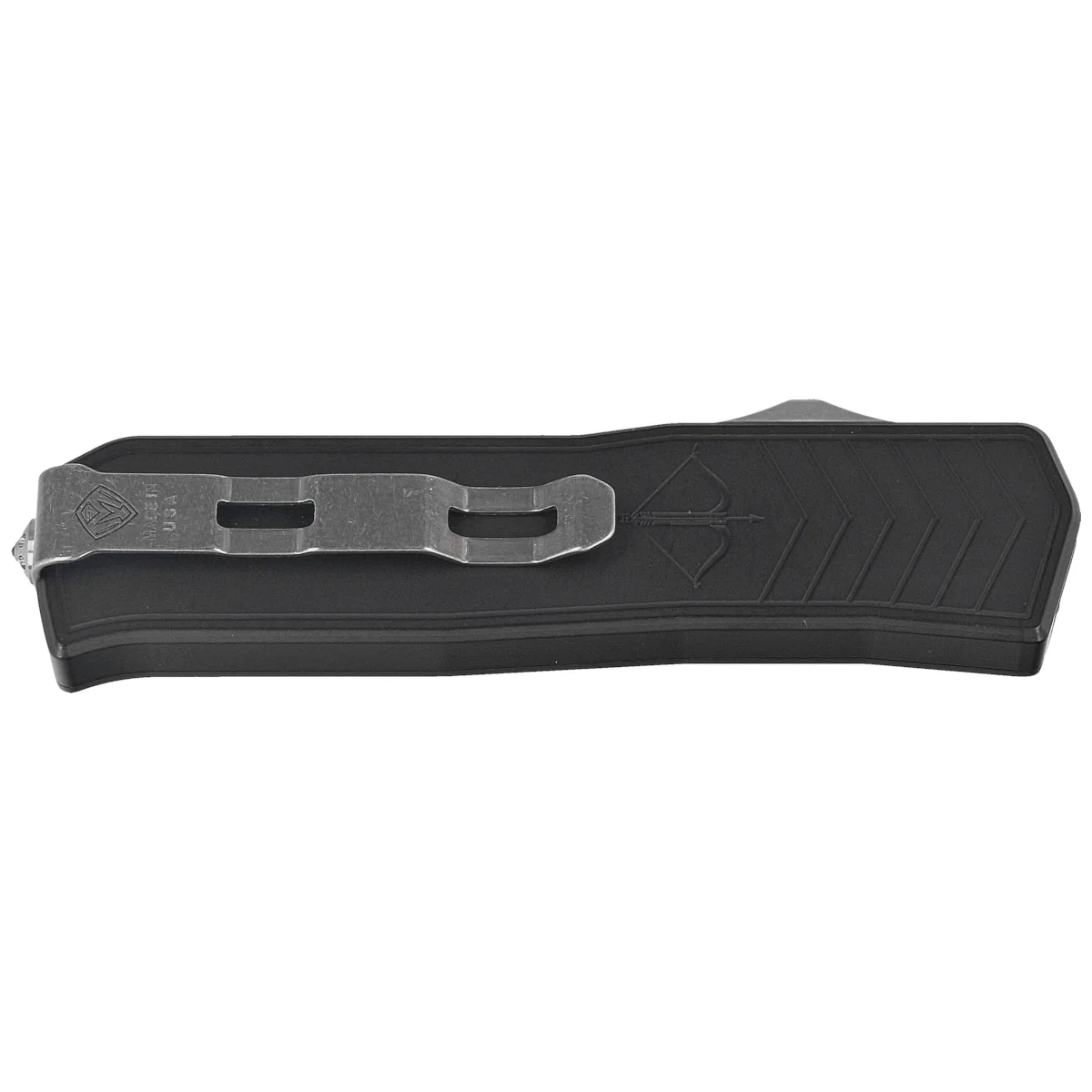 MERC-1™ Black Aluminum, Standard HW/Clip, Tumbled 100% made in the United States from American components, crafted by a veteran-owned company, this powerful OTF automatic knife is built with the signature durability and robustness characteristic of Medford.