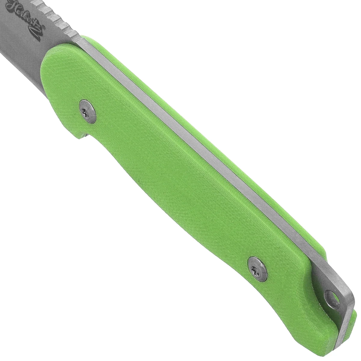 Handle - made of G10 composite, a synthetic glass laminate, offers resistance to water, dirt and mechanical damage. Thanks to the profiling for a small hand, the knife fits comfortably in the hand and allows for precise handling. The screw assembly facilitates eventual maintenance and increases the durability of the design. Subtle milling of the gripping surface improves grip, and the end with a cord hole allows additional protection of the knife during carrying or transportation. The design has been optimized for the safety of children and teens - offering a stable, easy-to-control grip without compromising on durability. Comes with a nylon sheath for trouncing the knife to the belt.
