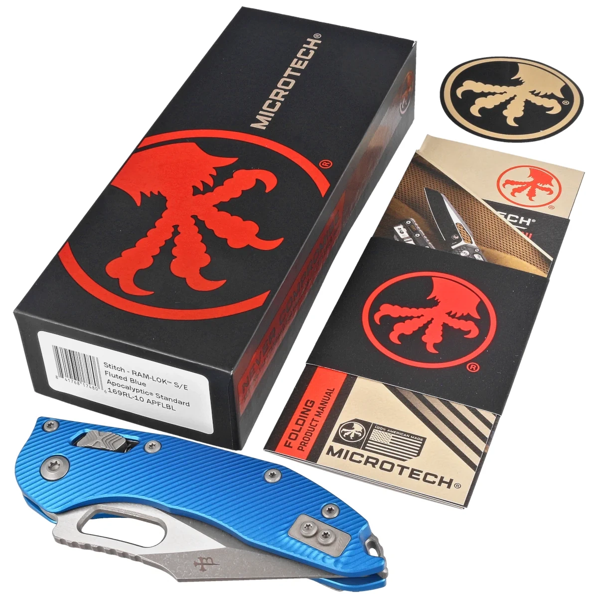 Microtech Stitch Ram-Lok S/E Knife Blue Fluted G10, Apocalyptic M390MK by Borka Blades and Tony Marfione (169RL-10APFLBL)