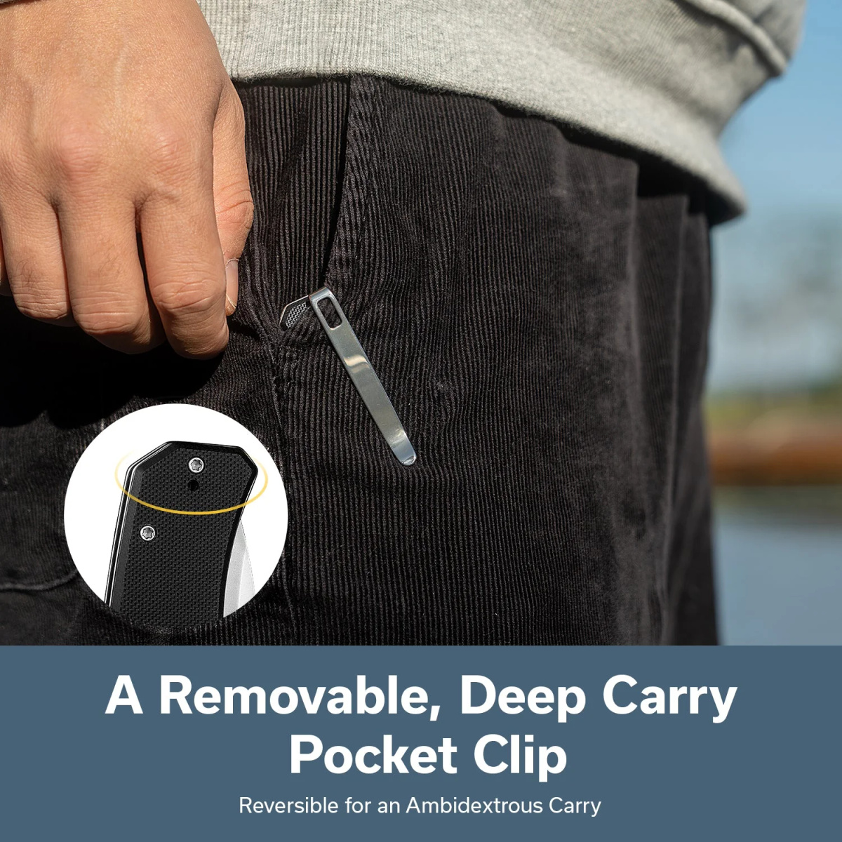 Handle - made of G10 composite, practically indestructible plastic, insensitive to weather conditions, resistant to chemicals and mechanical damage. Chamfered edges of the covers eliminate sharp edges for comfort, grip. Open-backed design fixed with steel spacer sleeves reduces weight and facilitates cleaning. A fore finger groove made on the front improves grip security. Two-position, right/left deep carry clip allows you to carry the knife discreetly in your pocket in tip-up position (blade tip up).