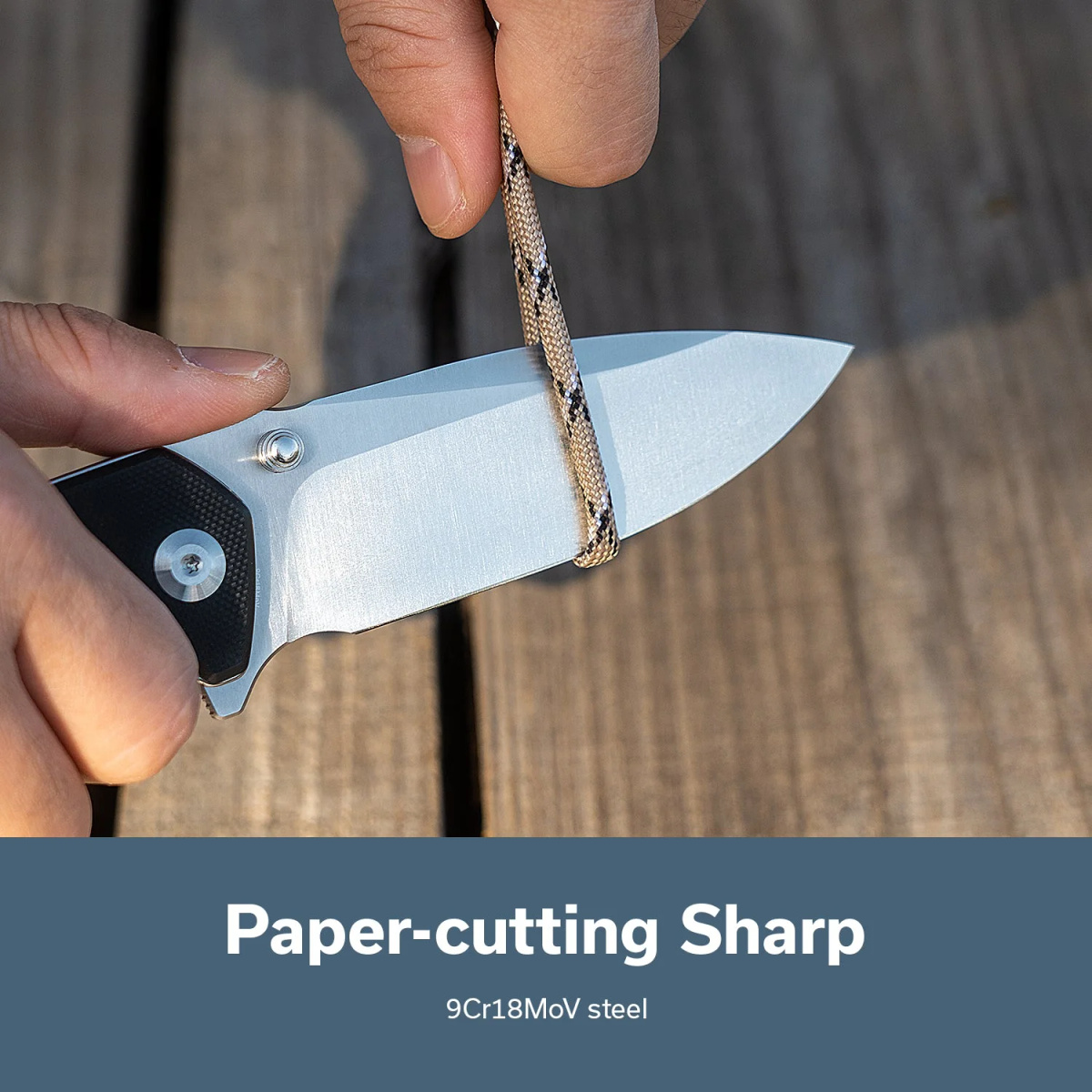 - Skarnax Black G10, Satin large EDC folder designed for daily use. Features a full-size G10 composite handle and a blade made of 9Cr18MoV stainless steel. It can be opened in two ways: using the flipper or the dual thumb studs on the blade.