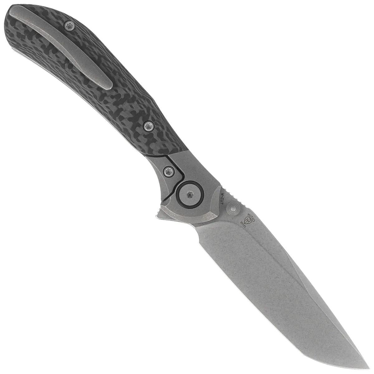 Handle - made of solid 6AL4V titanium with a perfectly integrated inlay made of 3K Twill Weave Skin Carbon Fiber composite. The chamfered edges of the covers eliminate sharp edges for comfort, and the fore finger groove improves grip confidence. The titanium backspacer to which the grips are attached guarantees the rigidity and strength of the entire construction. A single-position, right-handed titanium clip allows the knife to be carried in tip-up position, with the tip of the blade upward.