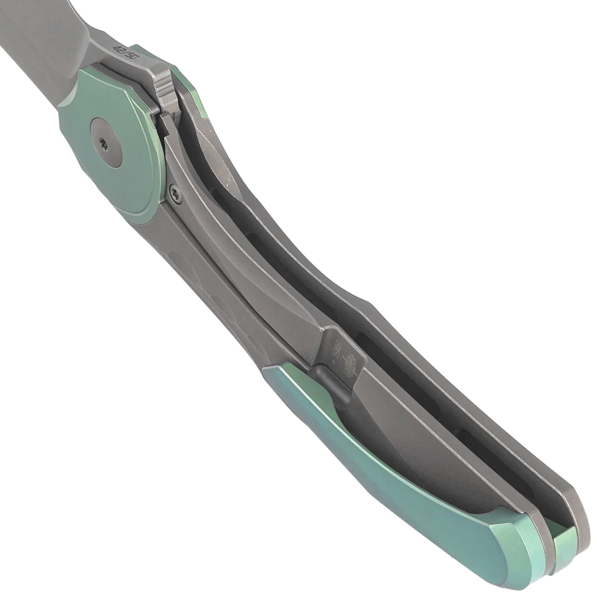 Handle - made of milled titanium 6AL4V, beveled edges of the covers eliminate sharp edges. The whole bolted to a solid backspacer, also made of titanium. The pivot axis is decorated with a bolster made of titanium in a contrasting color. A fore finger groove improves grip security. A single-position (right) titanium deep-carry clip allows you to carry the knife discreetly in your pocket in tip-up (blade tip up) position.