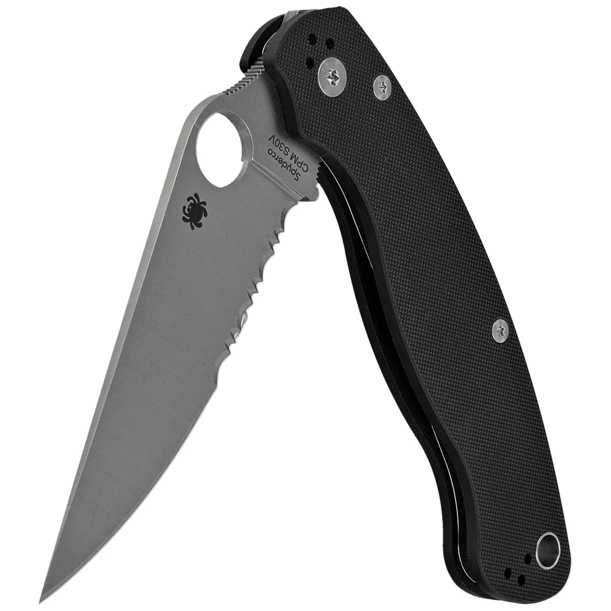 Blade - modified Clip Point profile with an enlarged 14 mm SpyderHole notch (Spyderco patent) that allows you to quickly open the knife even with a glove, enlarged thumb ramp with notches (spine jimping), which helps control the large blade. Index Finger Choil (notched profiled undercut for the index finger between the Handle and the cutting edge), prevents the folder from sliding in the hand when making powerful cuts. The partially serrated (P/S) blade, combined with the Full Flat Grind, results in excellent cutting edge geometry and extreme cutting performance.