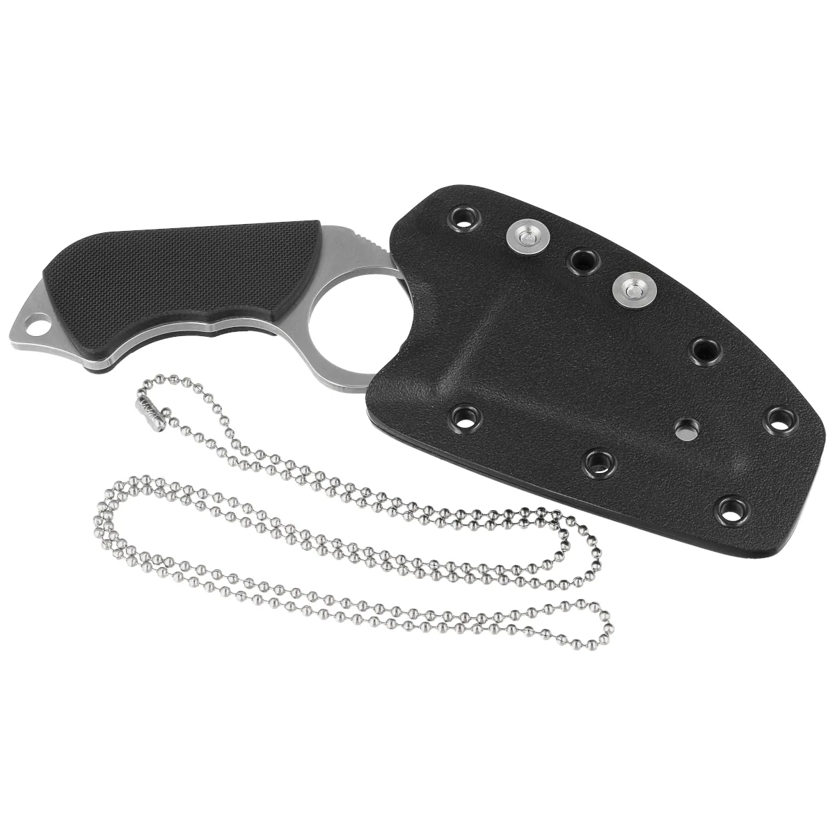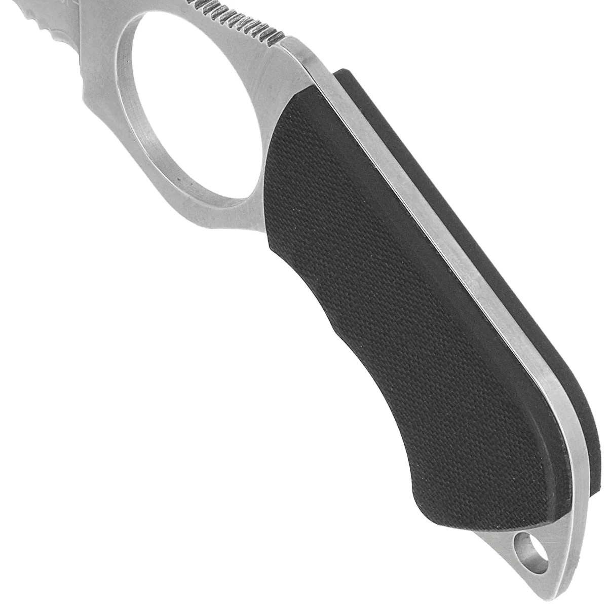 Swick 5 Large Black G10, Satin compact neck knife with a sheath suitable for hanging around the neck, which combines instant self-defense readiness with the convenience of everyday carry. Designed by Spyderco founder Sal Glesser, who drew inspiration from the innovative designs of French knifemaker Fred Perrin. It features a full-sized pistol-style handle and a large 26.1 mm finger hole, specifically designed to fit a man's hand, ensuring maximum control over the tool. Thanks to its thoughtful design, the Swick 5 Large is a reliable tool for both everyday use and situations that require a firm grip and precision cutting.