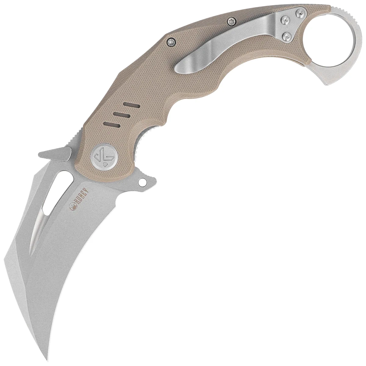 - Wrath Tan G10, Beadblasted compact karambit by MUZI Design. Curved blade made of Sandvik 14C26N steel, contoured G10 composite handle. Three ways of opening, flipper, thumb hole and quick opening against the edge of the pocket.