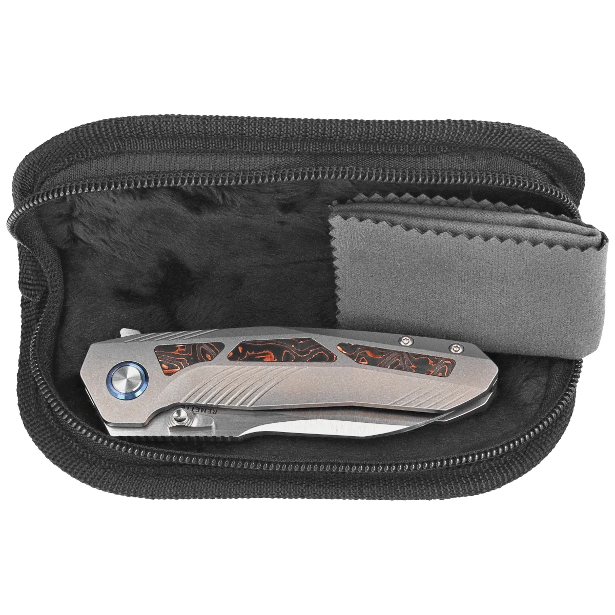 Handle - is thick pieces of titanium 6AL4V, contouring of the covers eliminates sharp edges. On both sides there is an inlay (insert) made of Copper Foil Carbon Fiber composite. Only a few companies are able to make the Handle with such incredible accuracy! The grips are joined together using a titanium backspacer. A right-handed, single-position titanium deep-carry clip allows you to carry the knife discreetly in your pocket in tip-up (blade up) position. The pivot axis is decorated with a titanium rim (pivot collar cap).