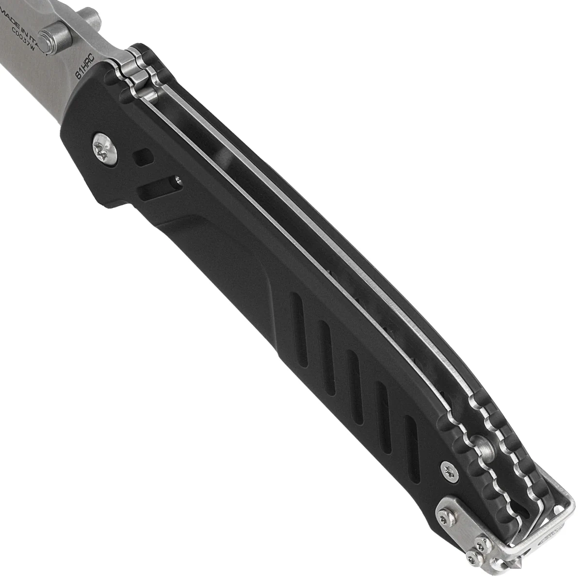 Handle - anodized aluminum grips ensure light weight and structural strength, with a series of holes for improved grip and structural relief. The open-backed design simplifies cleaning and maintenance. A sturdy left/right-handed clip allows the knife to be carried deep in a pocket (discreetly) in a tip-up position. The handle is finished with a window breaker.
