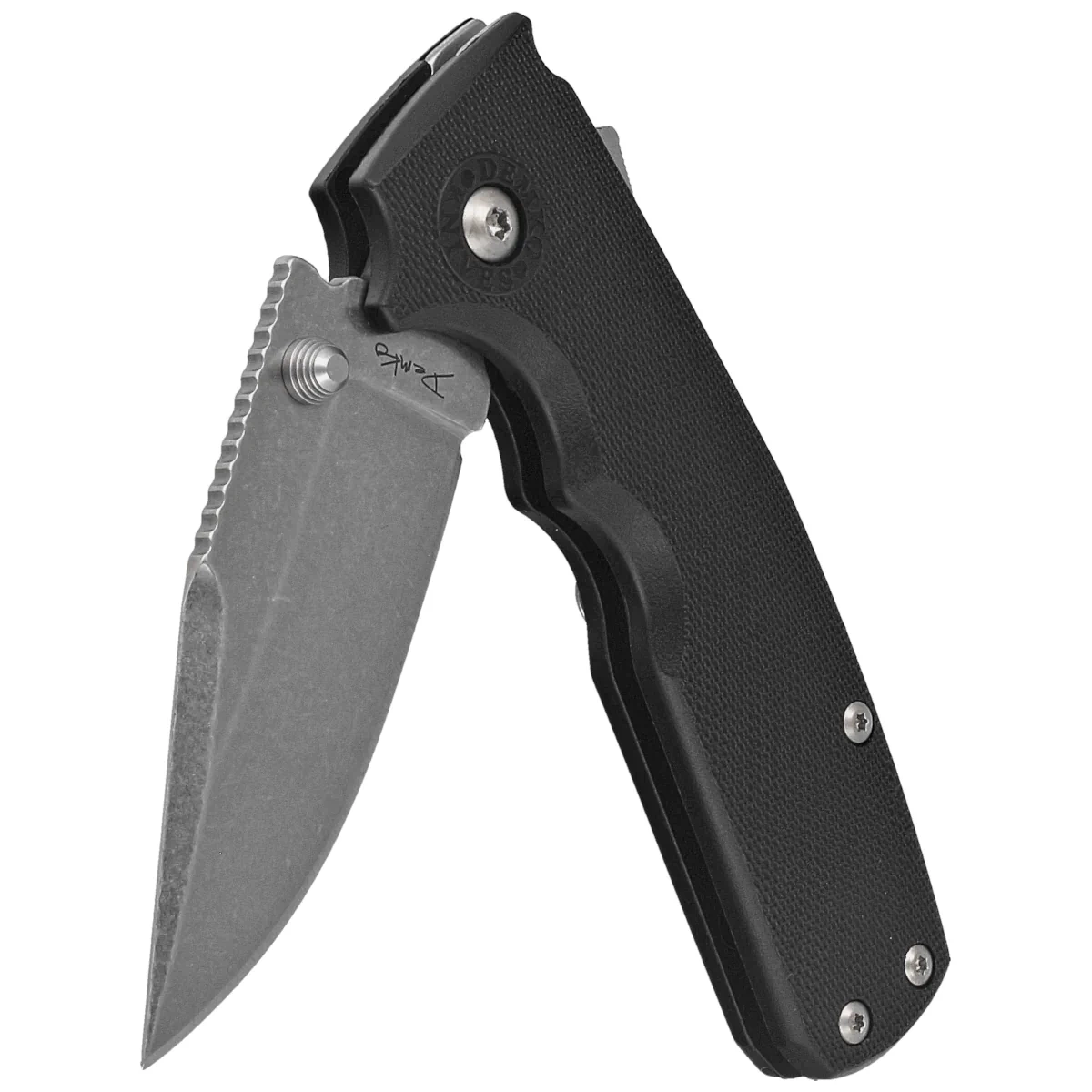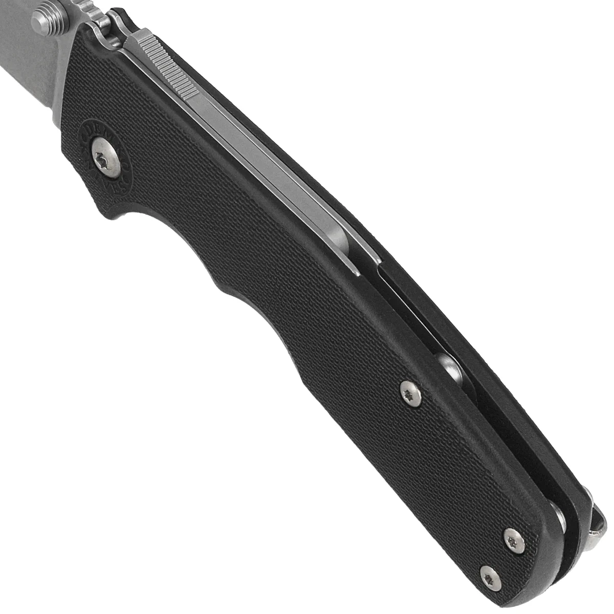 Blade - Clip Point, Stonewashed finish to hide scratches caused by use. The belly extends the length of the cutting edge in relation to the length of the slender blade, converging towards the needle-sharp tip of the knife. The thickness of the blade ensures high durability, while the high, flat grind gives the cutting edge perfect geometry and extreme cutting performance. Ball bearings assist in opening the blade with a dual thumb stud. The whole is locked with the Shark-Lock™, considered to be the world's strongest locking mechanism.