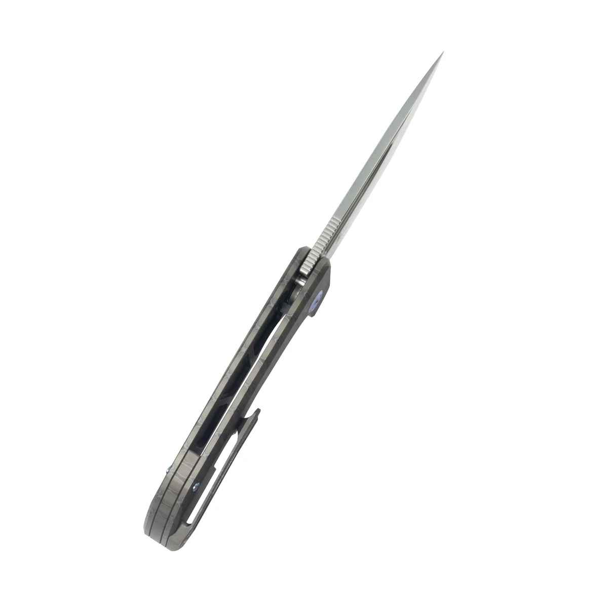 Handle - two pieces of solid titanium 6AL4V flame-colored with a Tiger Stripes pattern. The milled lines on the surface improve grip and add aesthetic charm. The beveled edges of the covers eliminate sharp edges for comfort and improve grip. The massive titanium backspacer to which the grips are attached guarantees the rigidity and strength of the entire construction. The simple, solid design guarantees many years of use. A deep forefinger groove improves grip. The pivot point is adorned with a stylized Kubey Knife logo. The single-position (right) titanium deep carry clip allows you to carry the knife discreetly in your pocket in a tip-up position (with the tip of the blade up).