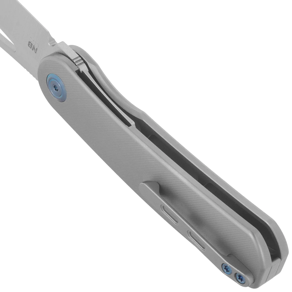 Handle - profiled grips made of titanium 6AL4V, micro-milled with a fine texture. The whole is screwed to a solid backspacer, also made of titanium. The simple, solid construction ensures many years of use. The pivot axis is decorated with a titanium cap (Pivot Cap) in a contrasting color. The two-position (right/left) titanium deep carry clip allows you to carry the knife discreetly in your pocket in a tip-up position (with the tip of the blade up). The forefinger groove improves grip and creates a mini guard to prevent your hand from slipping onto the blade.