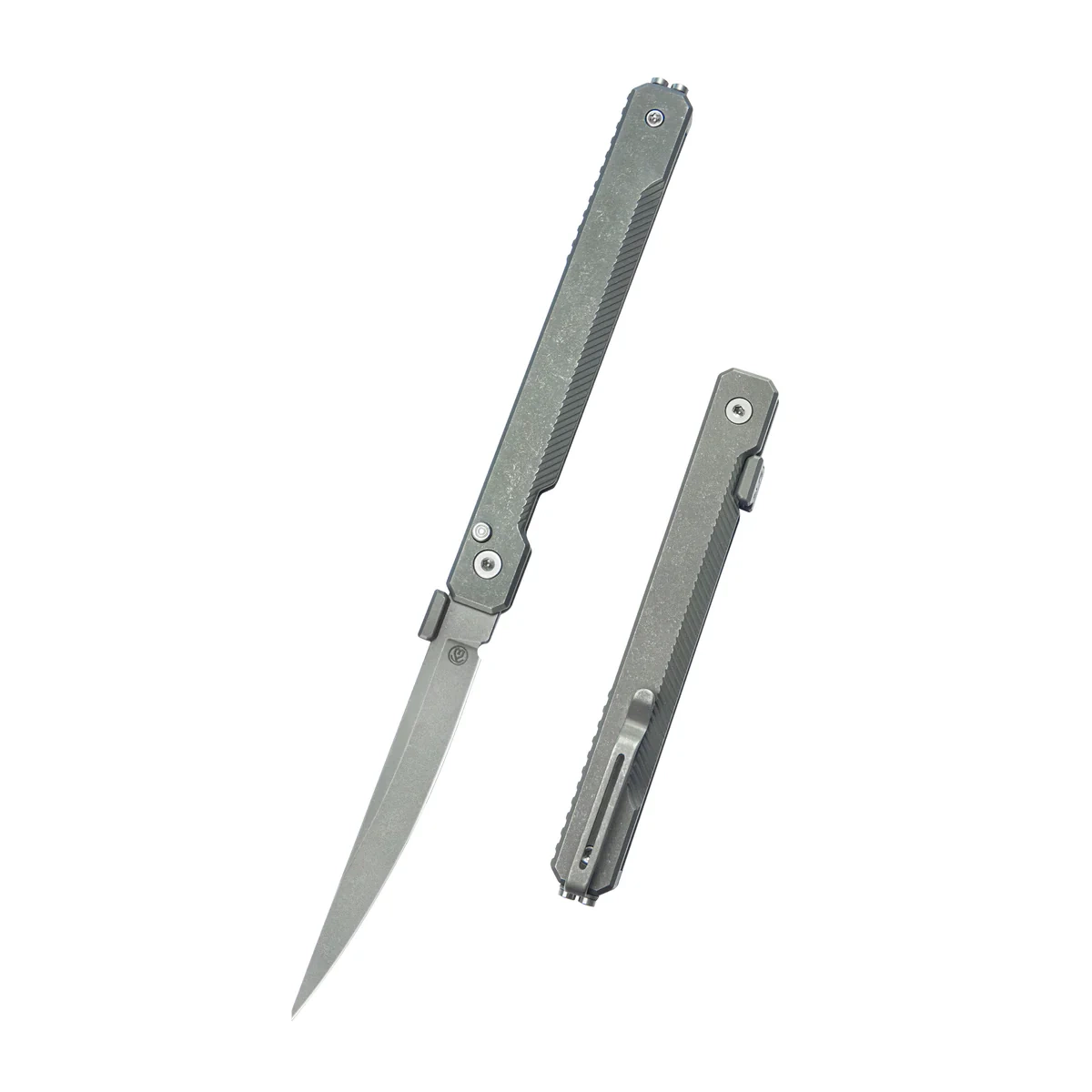 Handle - grips made of titanium 6AL4V, a material with extremely high mechanical strength and virtually complete resistance to weather conditions and chemicals. The whole is screwed to a solid backspacer, also made of titanium 6AL4V. The simple, solid construction ensures many years of use. The forefinger groove improves grip and creates a mini guard to prevent the hand from slipping onto the blade. The two-position (right/left) titanium deep carry clip allows the knife to be carried discreetly in the pocket in a tip-up position (with the tip of the blade up).