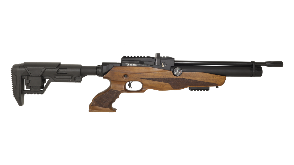- Reximex Tormenta Lite W – PCP air rifle with a compact, tactical stock with a pistol grip made from Turkish walnut. The rifle is equipped with a side-lever cocking mechanism, a telescopic stock with an adjustable cheek rest, and a precision-rifled barrel.