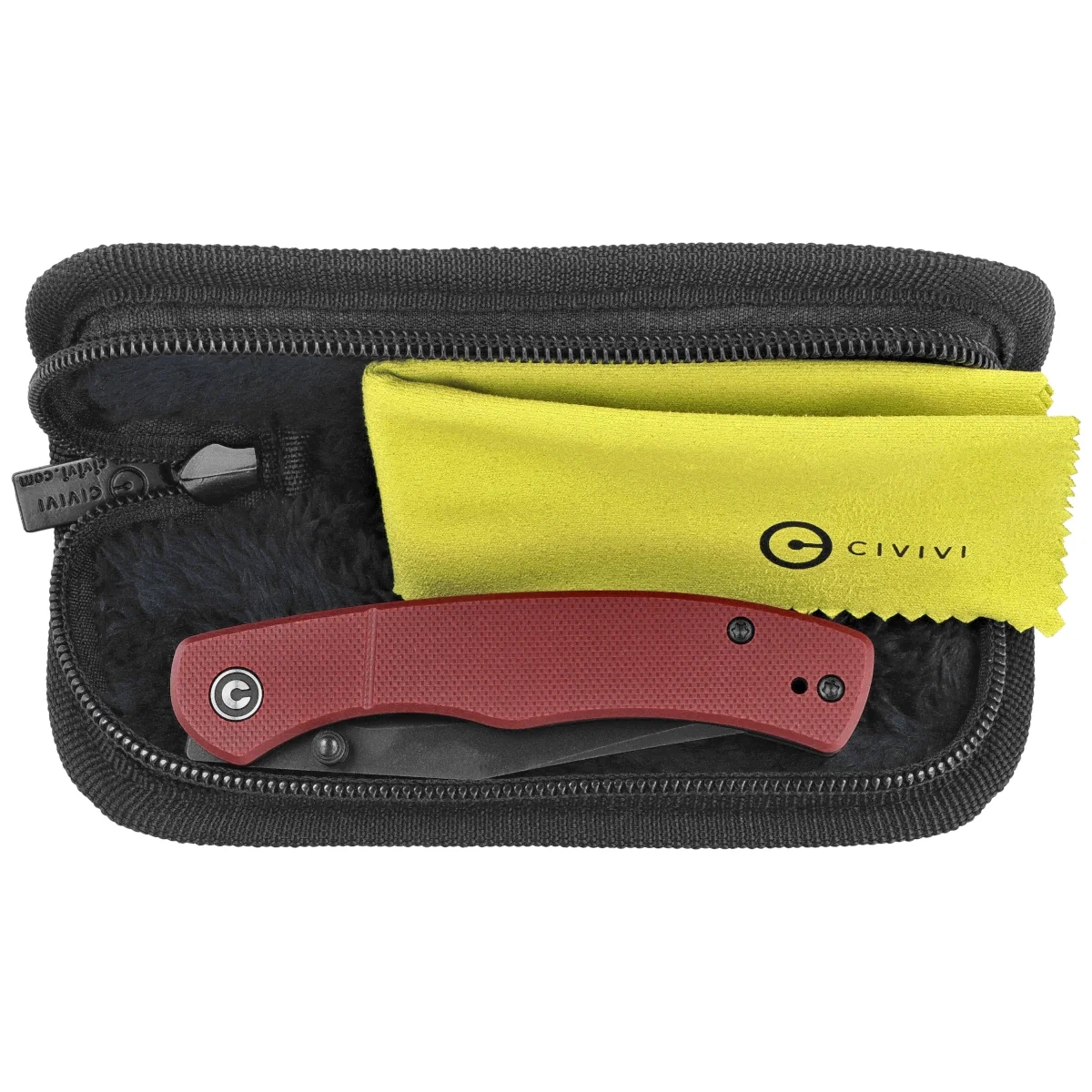 Handle - rough grips made of G10 composite, a virtually indestructible material that is insensitive to weather, resistant to chemicals and mechanical damage, which are screwed onto steel liners. The open-backed design, which is attached with steel spacer sleeves, reduces weight and facilitates cleaning. The simple, reliable design ensures many years of use. The deep carry clip, two-position (right/left), allows the knife to be carried in a tip-up position. The pivot axis is decorated with the stylized Civivi logo.