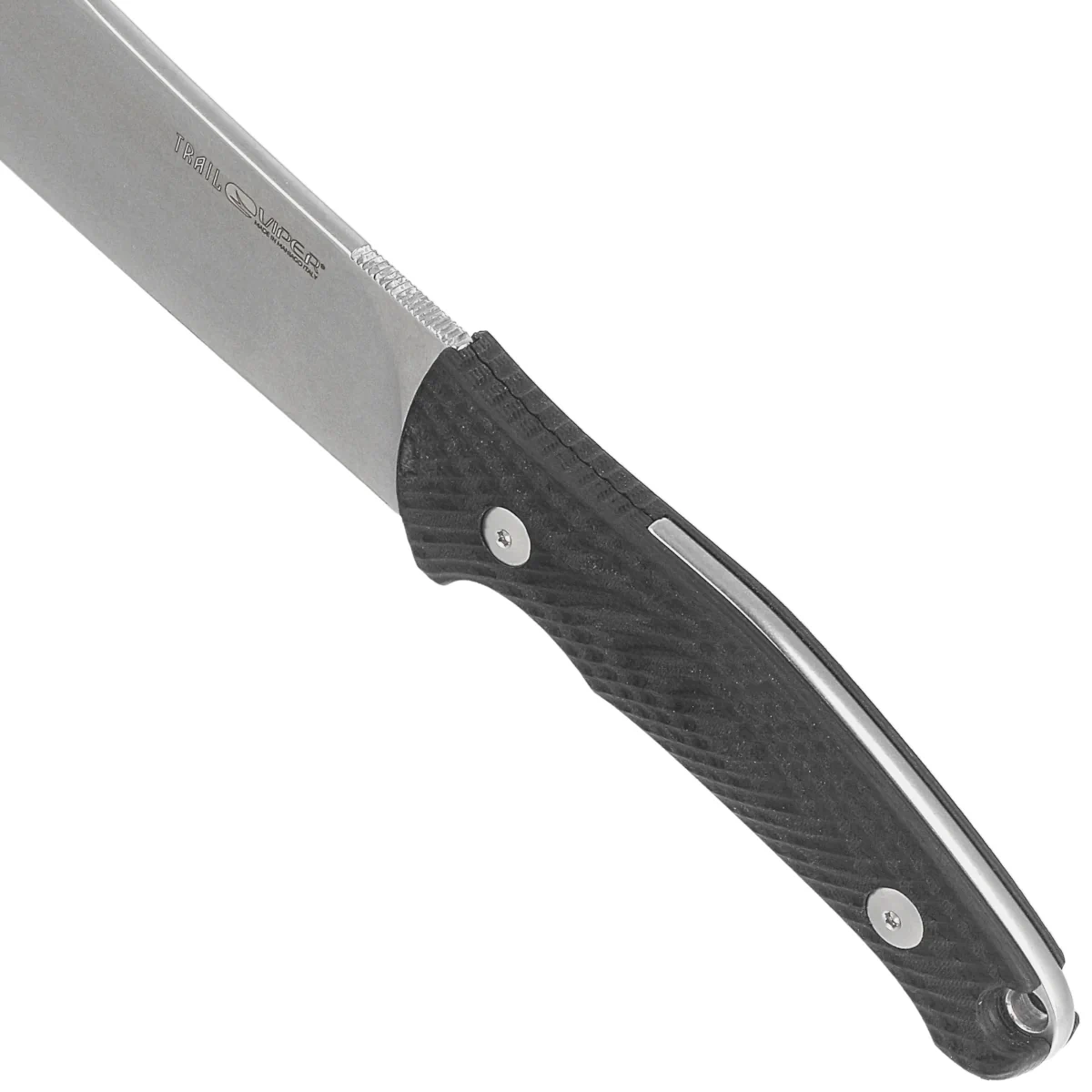 Trail Black Suretouch, Stonewashed is an advanced all-terrain knife designed by the renowned Danish knifemaker Jens Ansø. The blade is made of Böhler N690Co stainless steel, which is corrosion-resistant and easy to sharpen. The semi-hidden tang construction and blade profile guarantee excellent durability during intensive field work. The handle is made of the modern composite material Suretouch, which combines the properties of rubber and laminate. This ensures a secure grip, even with wet or gloved hands. The material is resistant to mechanical damage, moisture and extreme temperatures. The whole is complemented by a solid sheath made of natural leather. It is equipped with a practical belt attachment for convenient carrying of the tool. Every detail of the knife shows the designer's attention to ergonomics, aesthetics and solid workmanship. The product is appreciated by both collectors and users who require reliable equipment.