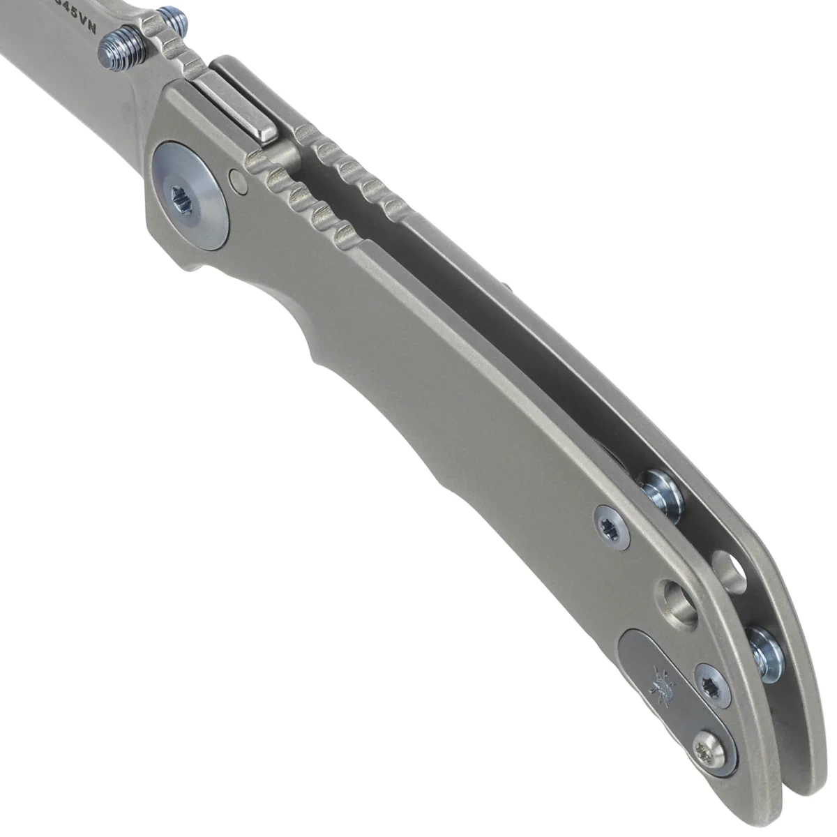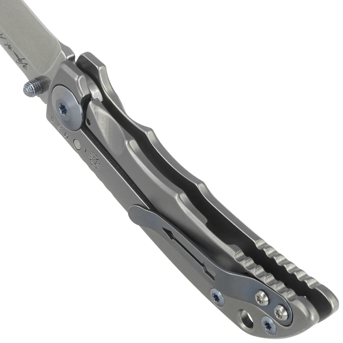 Handle - made of 6AL4V titanium, it has beveled edges on the covers, eliminating sharp points. The open-backed design without a typical backspacer, attached to each other with titanium spacers, makes cleaning easier. The simple but solid design guarantees many years of use. There are notches (jimping) on the edges of the handle to improve grip. The pivot axis is decorated with a designer screw, and all fasteners (screws, clips) are gray. A double-sided (right/left) titanium clip, decorated with an arrow motif, allows the knife to be carried in a tip-up position. Above the clip, there is a hole for threading a safety line.