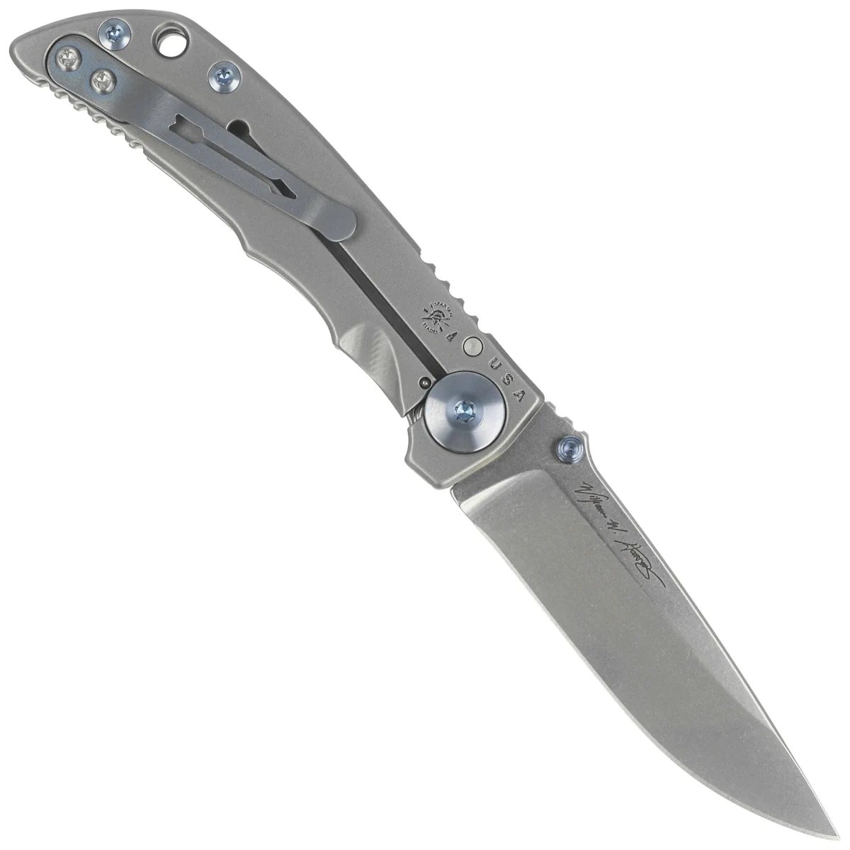 - Spartan Harsey Folder 3.25 Gray Titanium, Blue HW, Stonewashed, compact edition of the tactical folder designed by knifemaking legend Bill Harsey. Ergonomic titanium handle, blade made of high-quality MagnaCut steel, secure frame lock.