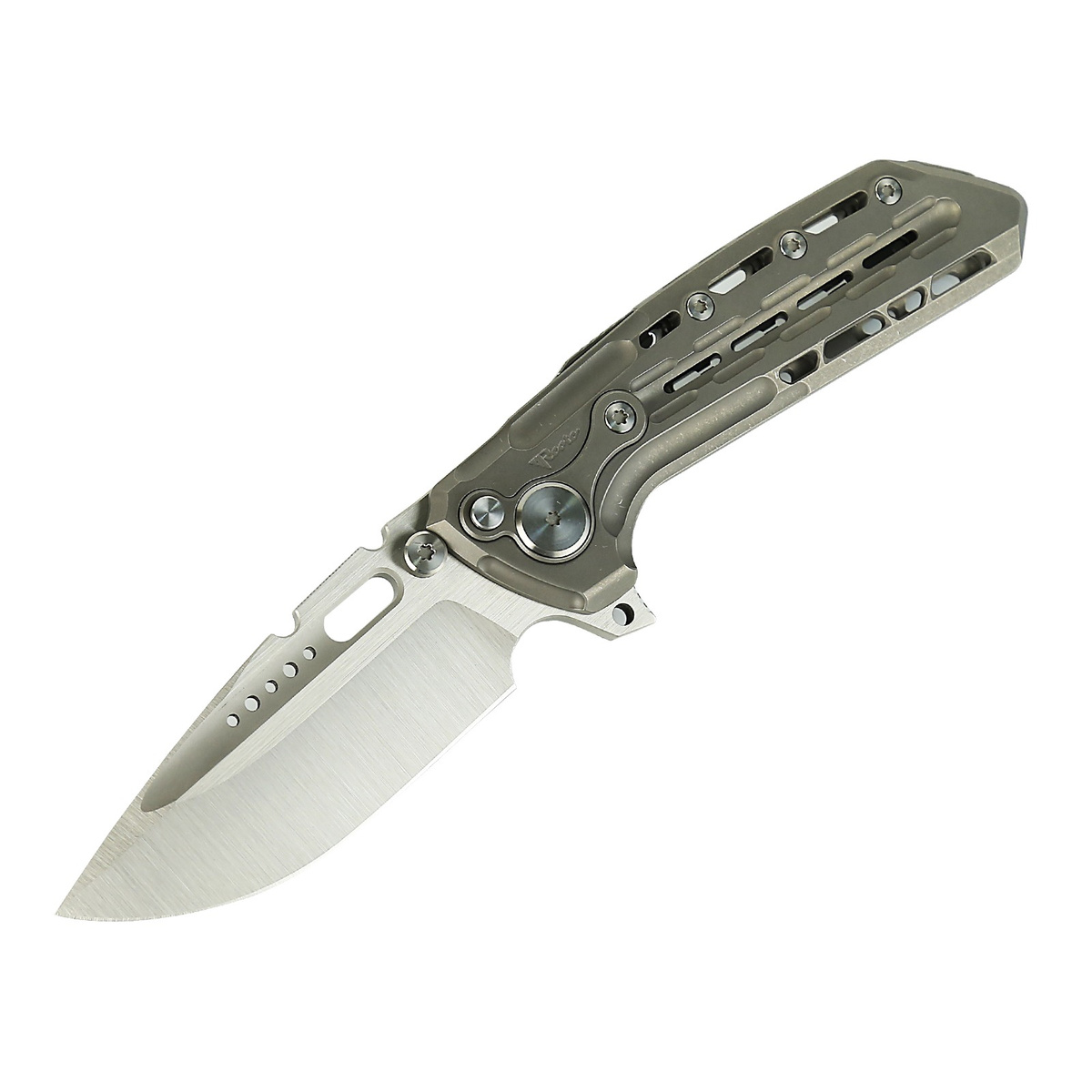 Handle - made of solid titanium 6AL4V, perfectly milled on CNC machines. The contouring of the covers eliminates sharp edges, and the openwork surface improves grip. Only a few companies are able to make a handle with such incredible accuracy! The grips are connected by a titanium backspacer. A single position titanium clip (right) allows the knife to be carried in a tip-up position. On the spine, a slider releases an additional lock in the form of two steel rollers located above the pivot axis. The lock also works when the knife is closed, preventing accidental opening. The protruding part of the backspacer can be used as an improvised ice pick, it also has a hole for a safety or decorative cord.