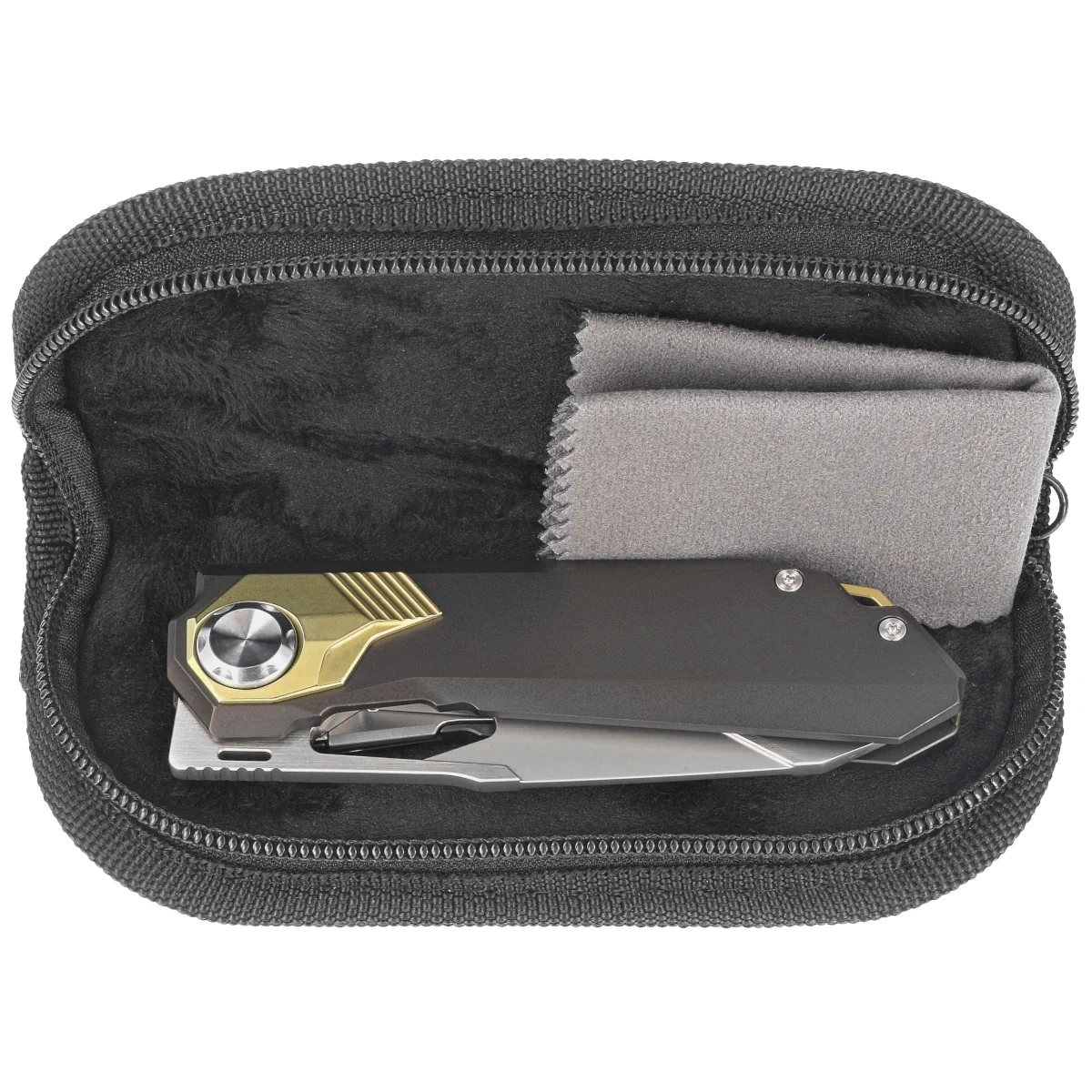 Peregrine Falcon Brown / Gold Titanium, Hand Grinding Pearlescent, a unique EDC folder that combines excellent functionality with a unique style. Hand-ground reverse tanto blade with a pearlescent sheen. Front flipper: a quick flipper that allows the knife to be opened instantly with one hand; it can also be opened using the hole in the handle. It is particularly useful in situations where every second counts. The lightweight and durable titanium handle adds both elegance and durability. Equipped with the innovative and intuitive Button Liner Lock, which allows you to safely fold the knife while keeping your fingers away from the blade. This model has an additional safeguard against accidental release of the lock. The Remette Peregrine Falcon is more than just a tool – it is a statement of personal style and passion. Its compact size means it fits easily into any pocket, and the quality of workmanship and unique design are sure to catch the eye.