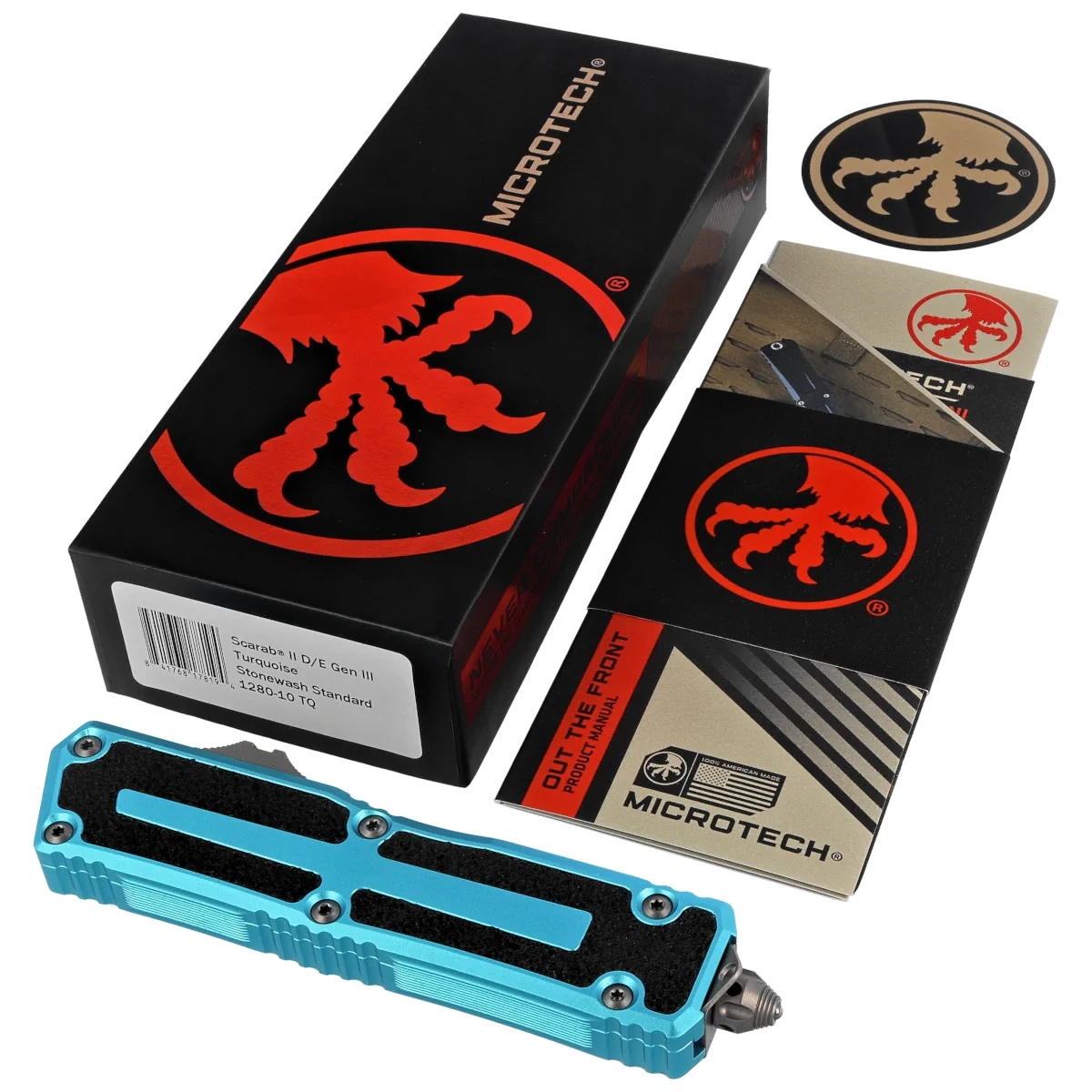 Scarab II Gen III D/E Turquoise Aluminum/3M, Stonewashed is the pinnacle of excellence in automatic tactical knives, taking inspiration from the original Microtech Ultratech design. Built to withstand the toughest conditions, the new Scarab II is the ultimate choice for heavy use. While retaining the styling features of its predecessor, it sets a new standard for OTF (Out The Front) technology.