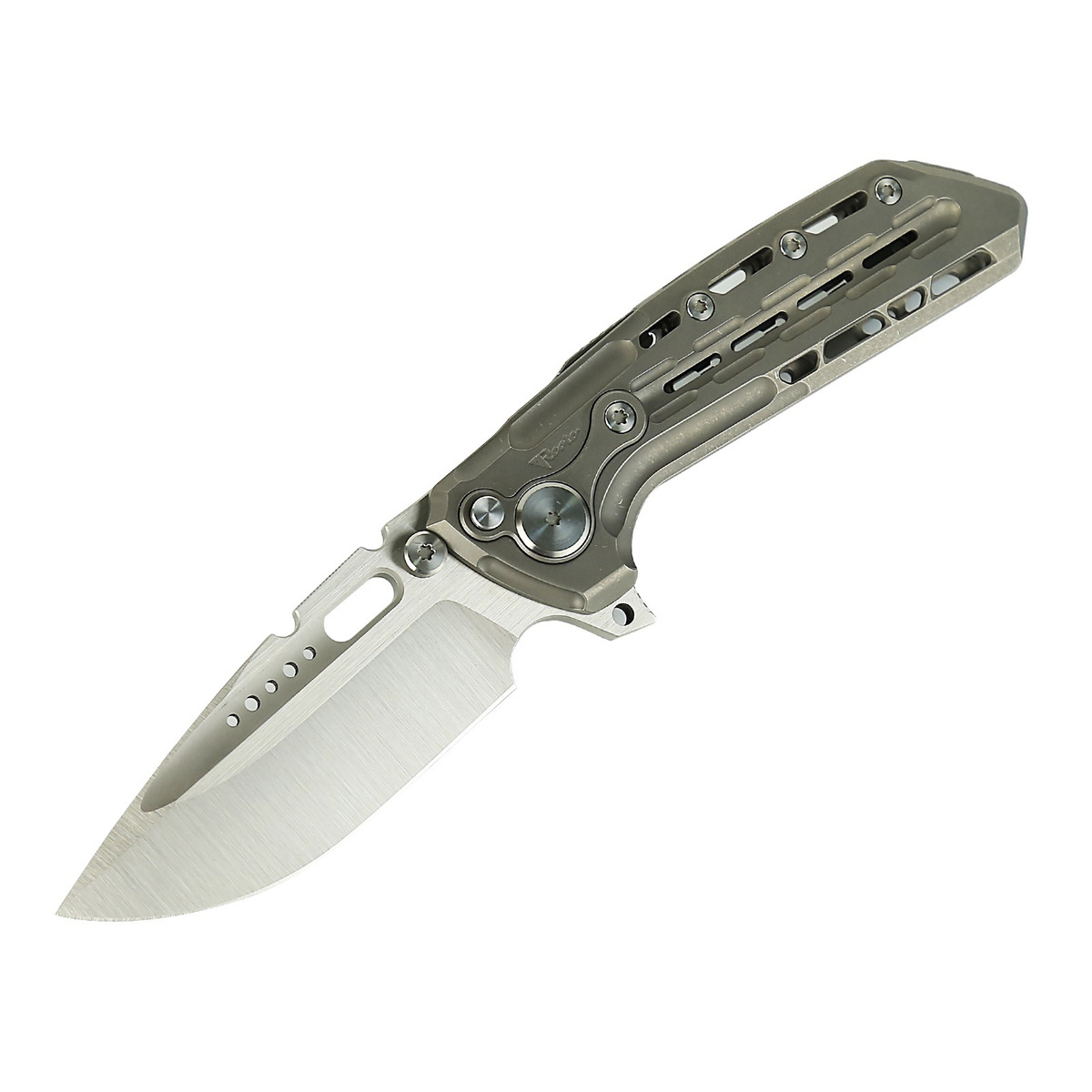 Handle - made of solid titanium 6AL4V, perfectly milled on CNC machines. The contouring of the covers eliminates sharp edges, and the openwork surface improves grip. Only a few companies are able to make a handle with such incredible accuracy! The grips are connected by a titanium backspacer. A single position titanium clip (right) allows the knife to be carried in a tip-up position. On the spine, a slider releases an additional lock in the form of two steel rollers located above the pivot axis. The lock also works when the knife is closed, preventing accidental opening. The protruding part of the backspacer can be used as an improvised ice pick, it also has a hole for a safety or decorative cord.