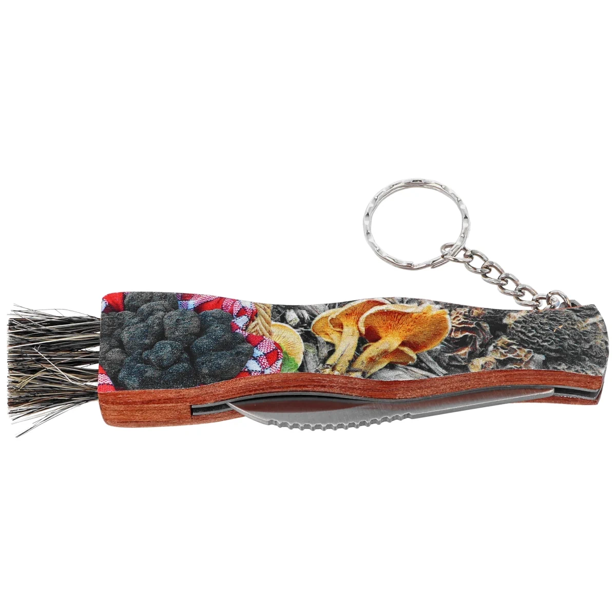 Handle - made of natural wood is distinguished by a 3D print with a mushroom motif, which not only gives the knife character, but also increases its visibility in the mulch. A natural bristle brush is placed in the back , allowing you to pre-clean mushrooms without having to carry separate accessories. Built-in metal tweezers allow thorough removal of needles and mosses. A key ring with a short chain makes it easy to attach to a backpack or pants, and the included pouch supports convenient carrying in the field. The ergonomic shape and well-balanced balance of the Handle guarantee comfort even for extended periods of use. This is a construction designed for efficient mushrooming - lightweight, handy and resistant to field conditions.