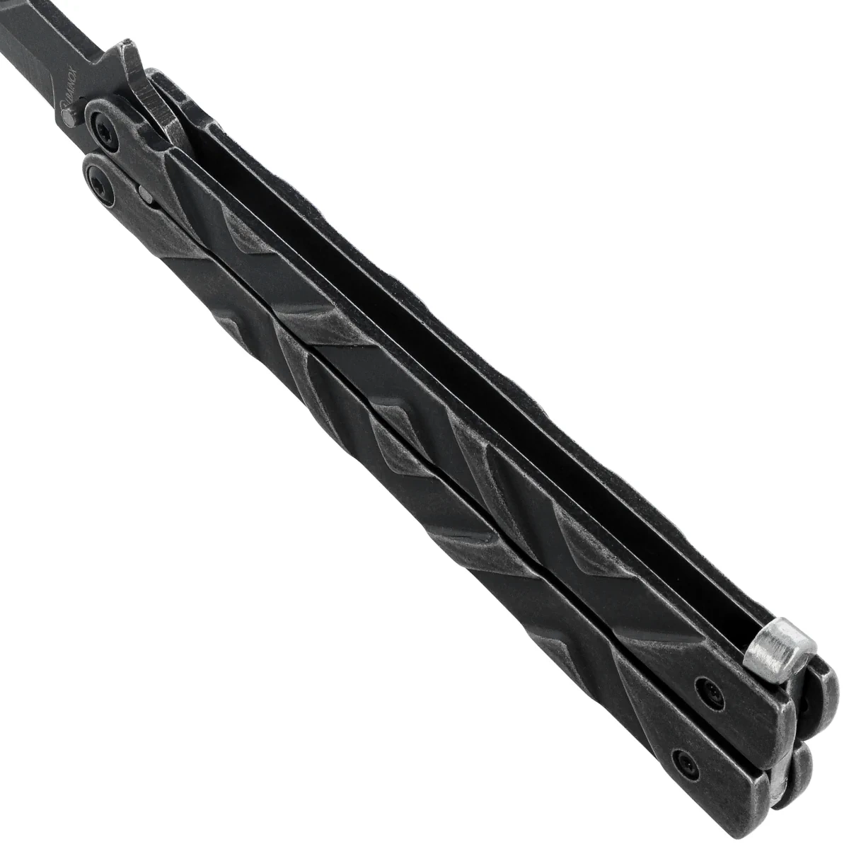 Handle - made of stainless steel with a stonewashed finish, which ensures durability, a consistent look with the blade and resistance to signs of wear. The symmetrical arm layout supports the balance of the knife, which is crucial when performing spins and tricks. The lack of texture is compensated by the balance and length of the handle, which translates into a stable grip. The handle has no clip or lanyard hole - this is a deliberate simplification, in line with the demonstration and training character of the design. The whole is closed with a classic latch, which locks the blade in both positions and allows for quick securing of the knife. The 02105 model is a solid, minimalist choice for those looking for a stylish and durable butterfly knife for everyday practice or collecting.