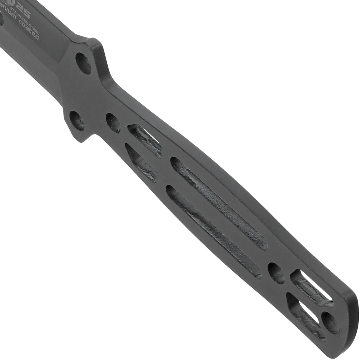 Handle - the skeletonized handle integrated into the blade offers low weight and full customization - the user can wind tape, leather or paracord, customizing the grip to individual preference. Technological holes reduce weight and improve hand ventilation, and the symmetrical geometry allows the knife to be operated comfortably regardless of the grip. The lack of grips simplifies maintenance and enhances the rugged, tactical look of the overall design. It comes with a lightweight kydex she ath equipped with a chain, which allows you to carry the knife around your neck - always at hand, always ready for action. An ideal choice for those who value discretion, mobility and efficiency.