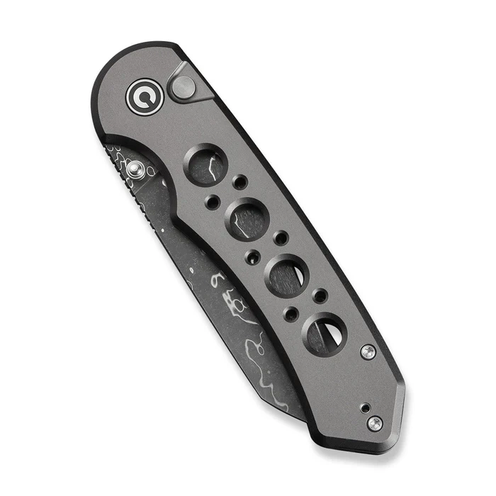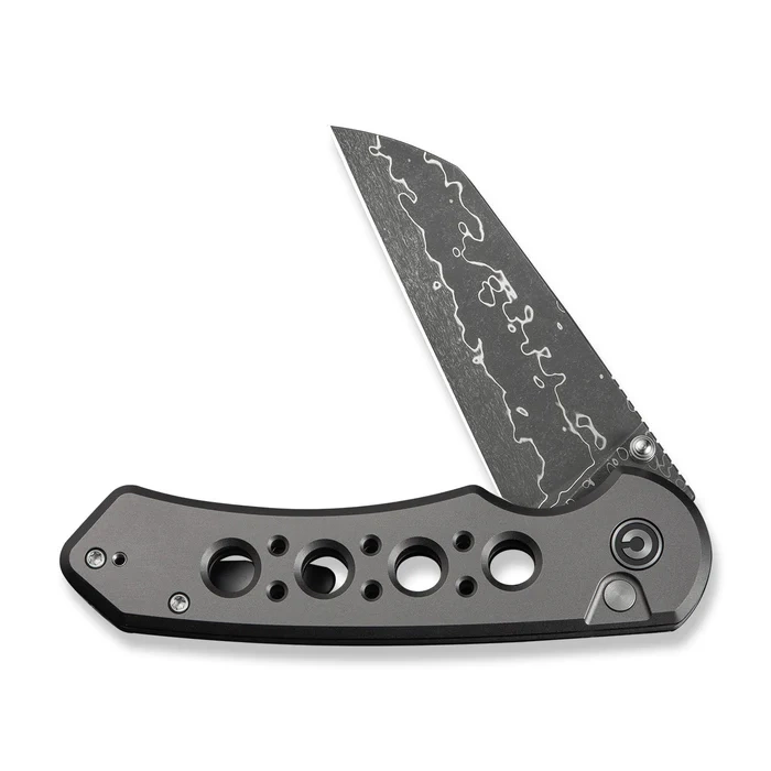 • Pragma Prime Gray Aluminum, Damascus - slim Civivi EDC folder with Wharncliffe profile Damascus steel blade, comfortable aluminum handle, intuitive button lock. Ergonomics and precision in a compact form.