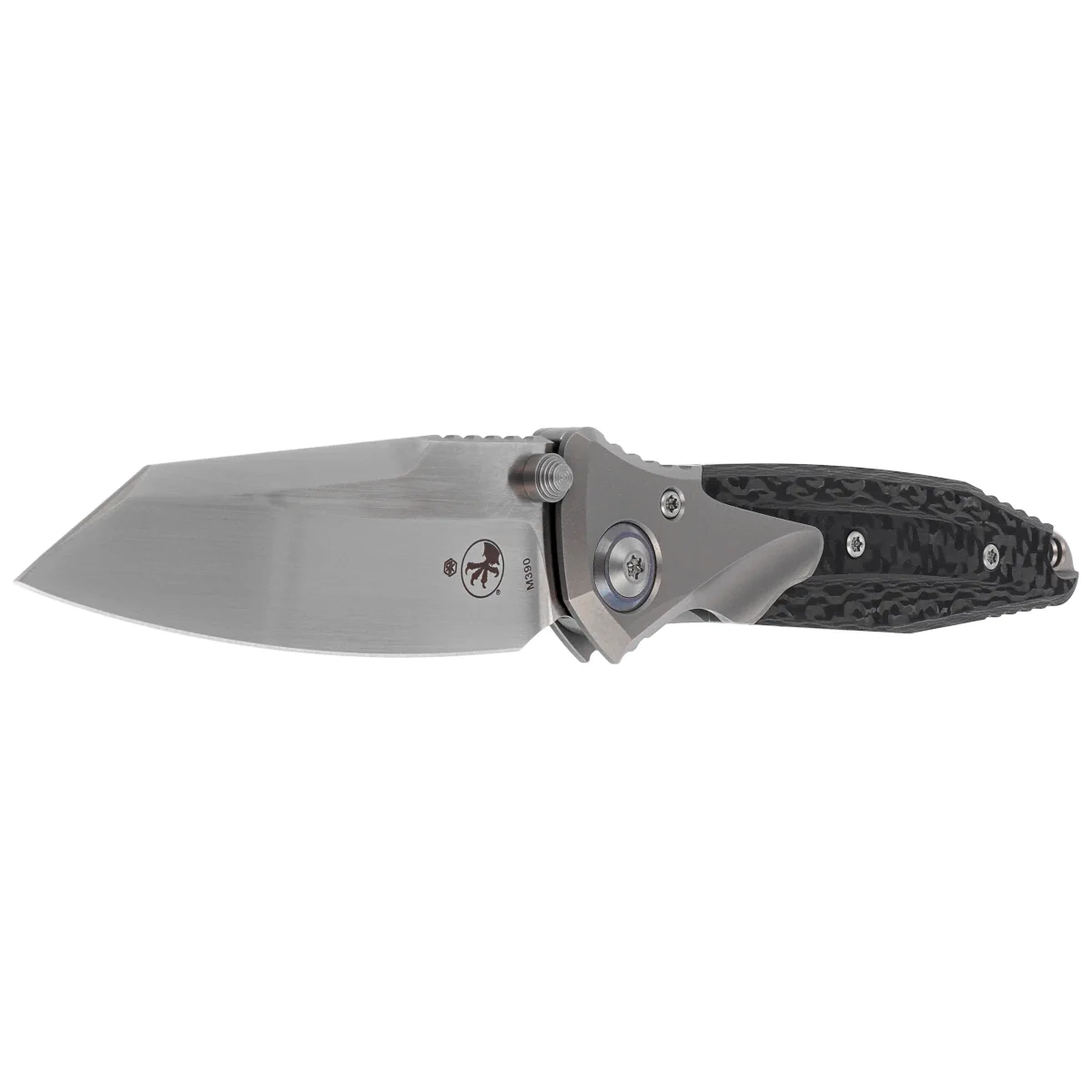 Handle - made with perfect precision in 3D technology on CNC milling machines from titanium. Perfectly fitted inlays (inlay) of Carbon Fiber composite make the knife does not slip in the hand during use. There are notches (jimping) on the back of the Handle for a more secure grip. The ergonomic profile and milled single-position (right) solid clip, allow the knife to be carried discreetly in the pocket, in tip-up(blade tip up) position. The pivot axis decorated with a blue rim (pivot collar cap). In the back there is a lanyard hole, a place for a safety or decorative cord. The protruding section of the titanium frame can be used as an improvised glass breaker.