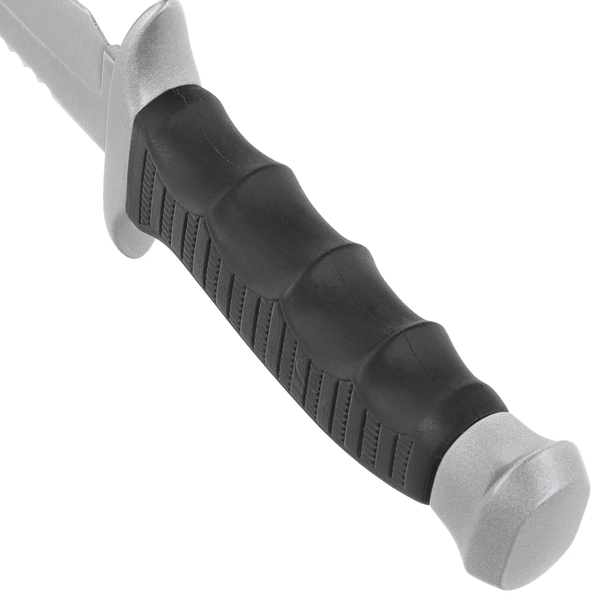 Muela 85-162 Gray Zamak/Black Rubber, Satin is  a large Bowie-style knife, designed for users who want functionality and confidence in field and tactical applications. Muela, offers in this model a full-size blade, suitable for intensive use - both in survival and professional applications. Blade is made of Nitro-42 steel, nitrided for increased corrosion resistance and improved mechanical performance. Its coating strengthens the surface and reduces the visibility of damage, while the pronounced bowie geometry allows for effective cuts with great control over the blade. As an added bonus, the blade has a dorsal saw, allowing it to cut through fibrous materials, extending the knife's functionality in the field. The handle is based on a construction of blackened zamak and textured rubber, which ensures high resistance to damage, excellent grip and durability in all weather conditions. The ergonomic grip profile makes it easy to operate the knife with gloves and in difficult terrain, while the integrated head and hilt improve safety. The Muela 85-162 is for those in need of a rugged field tool - reliable, versatile and ready for any task.