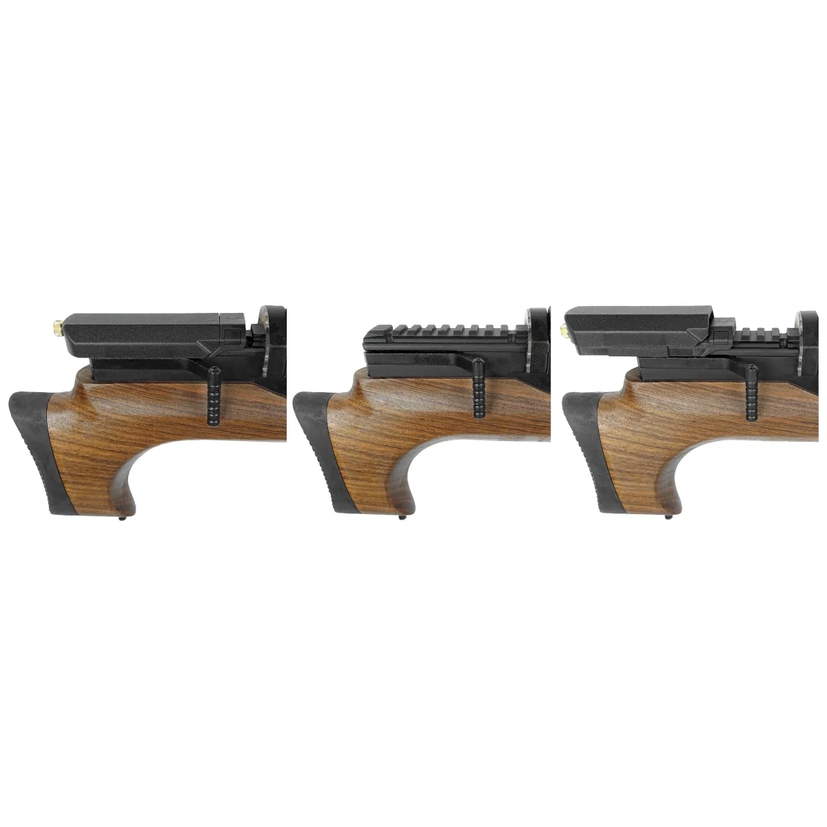 Magazine – rotary magazine with a capacity ranging from 14 to 10 pellets, depending on the selected caliber. Cocking the side lever simultaneously cocks the hammer, rotates the magazine, and chambers the next pellet. The set includes two magazines and a Single Shot Tray (Single Shot Adapter), enabling ultra-precise shooting by bypassing the magazine mechanism to avoid pellet deformation.