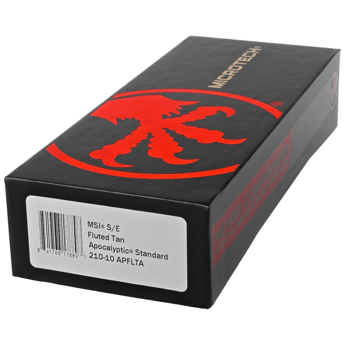 MSI S/E Ram-Lok Tan Fluted Aluminum, Apocalyptic folding knife that combines strength, durability and elegance. Its blade is made of excellent M390MK steel , which is the result of a collaboration between two renowned companies - Microtech and Böhler. This steel is known for its exceptional strength and long sharpness retention, making this knife unafraid of any challenge. The intuitive RAM-Lok ensures safety during use. This innovative lock is easy to operate and provides ease of use for both right and left-handed people. The Handle of the knife is made of aluminum, durable and ergonomic. Its shape is designed to fit perfectly in the hand, ensuring comfort even during prolonged use. This knife is not only a tool, but also a work of applied art. Its designer, Anthony Marfione, founder and owner of Microtech, has taken care of every detail. From the elegant finish to the satin details, this knife is both beautiful and practical. Whether you're looking for a reliable tool or an elegant accessory, MSI (Microtech Standard Issue) knife will meet your needs.