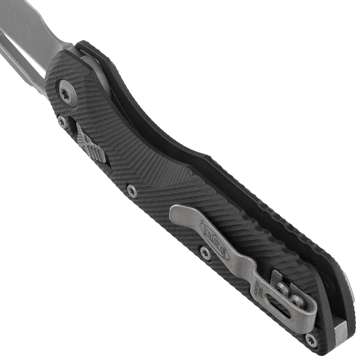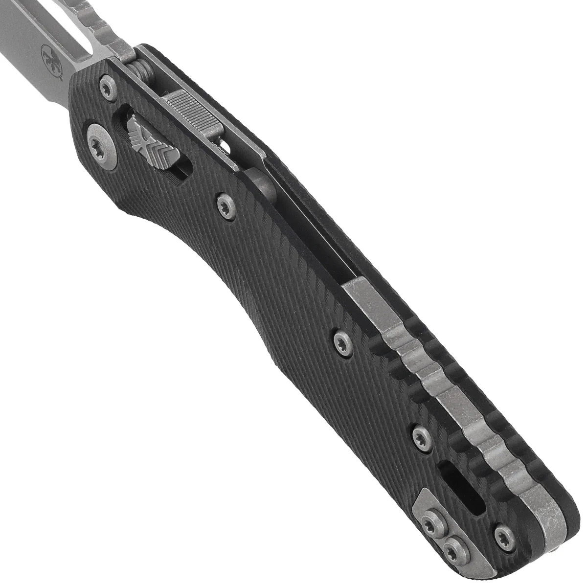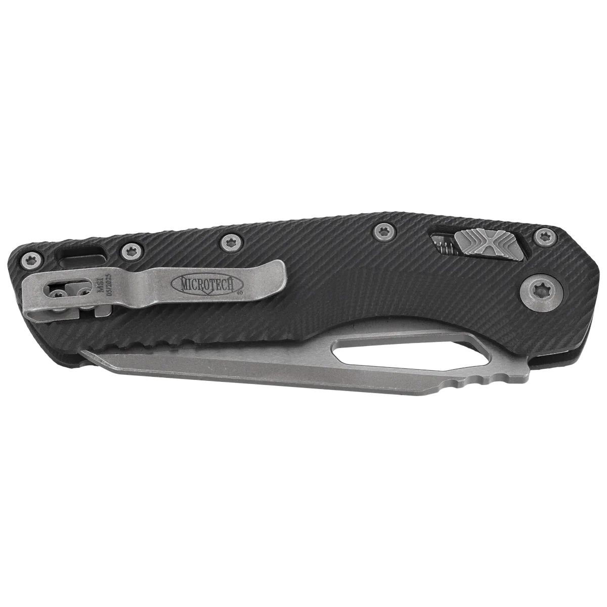 Handle - made of durable G10 composite, for better grip covered with milled lines(Fluted). Wide locking slide with Microtech's characteristic stepped X structure . Both grips are bolted together with a solid aluminum backspacer. The double-sided (right / left) clip allows you to discreetly carry the knife in tip-up position. Above the clip a lanyard hole, a place for a safety or decorative cord.