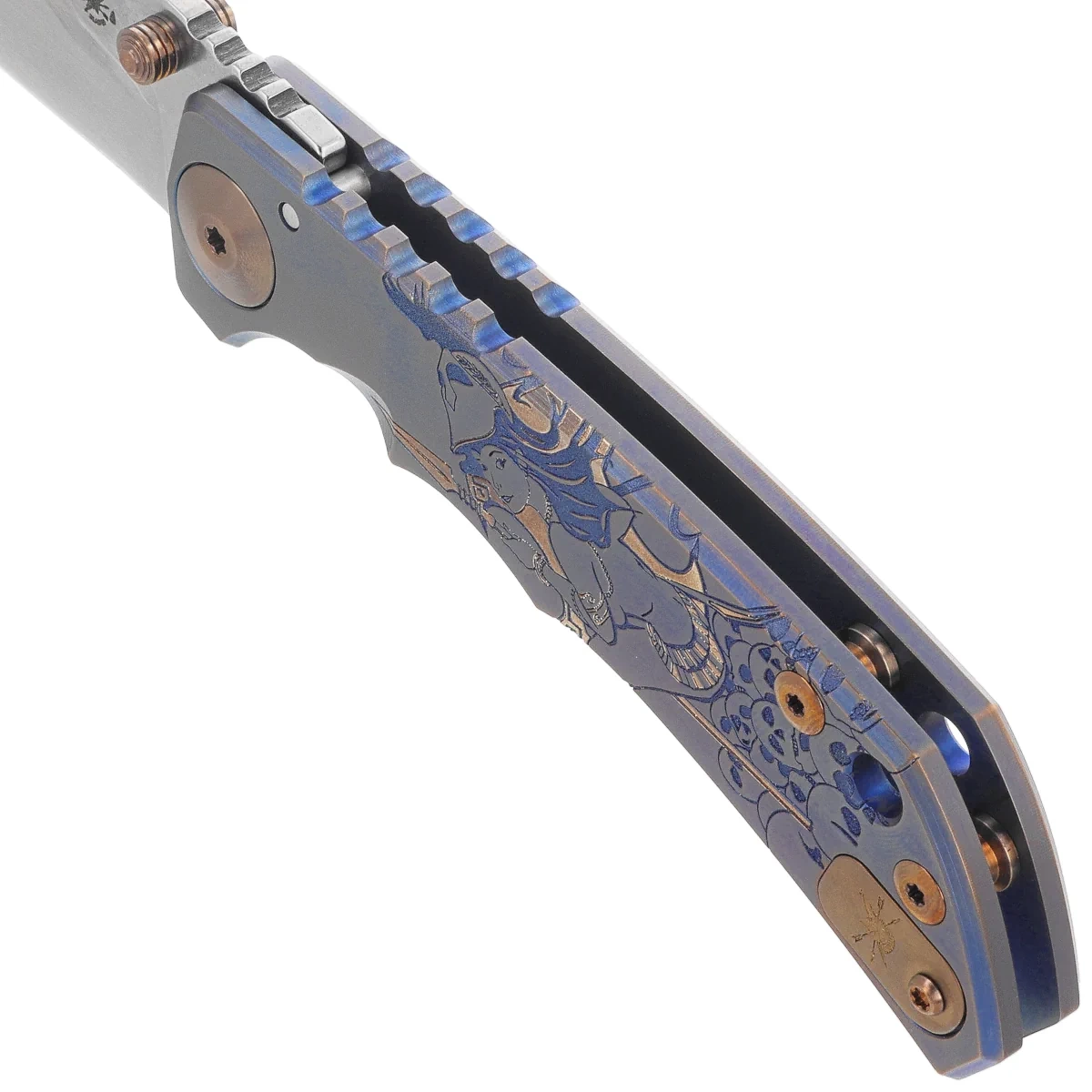 The solid titanium handle is decorated with an artistic engraving, depicting the motif of a young girl. The whole is complemented by bronze anodized details, which contrast strikingly with the blue hue of the Handle. Thanks to the properly contoured handle, the knife sits securely in the hand, ensuring precision when performing a variety of activities. The robust frame lock mechanism guarantees safe use even in extreme conditions. Each piece is handmade in the USA, making it a valuable and sought-after item among both collectors and discerning users.