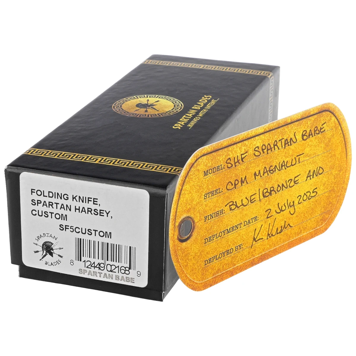 - Spartan Harsey Folder S.E. Babe Blue Titanium, Bronze HW, Satin, limited edition large tactical folder designed by knifemaking legend Bill Harsey. Ergonomic titanium handle decorated with engraving, Blade made of MagnaCut steel.