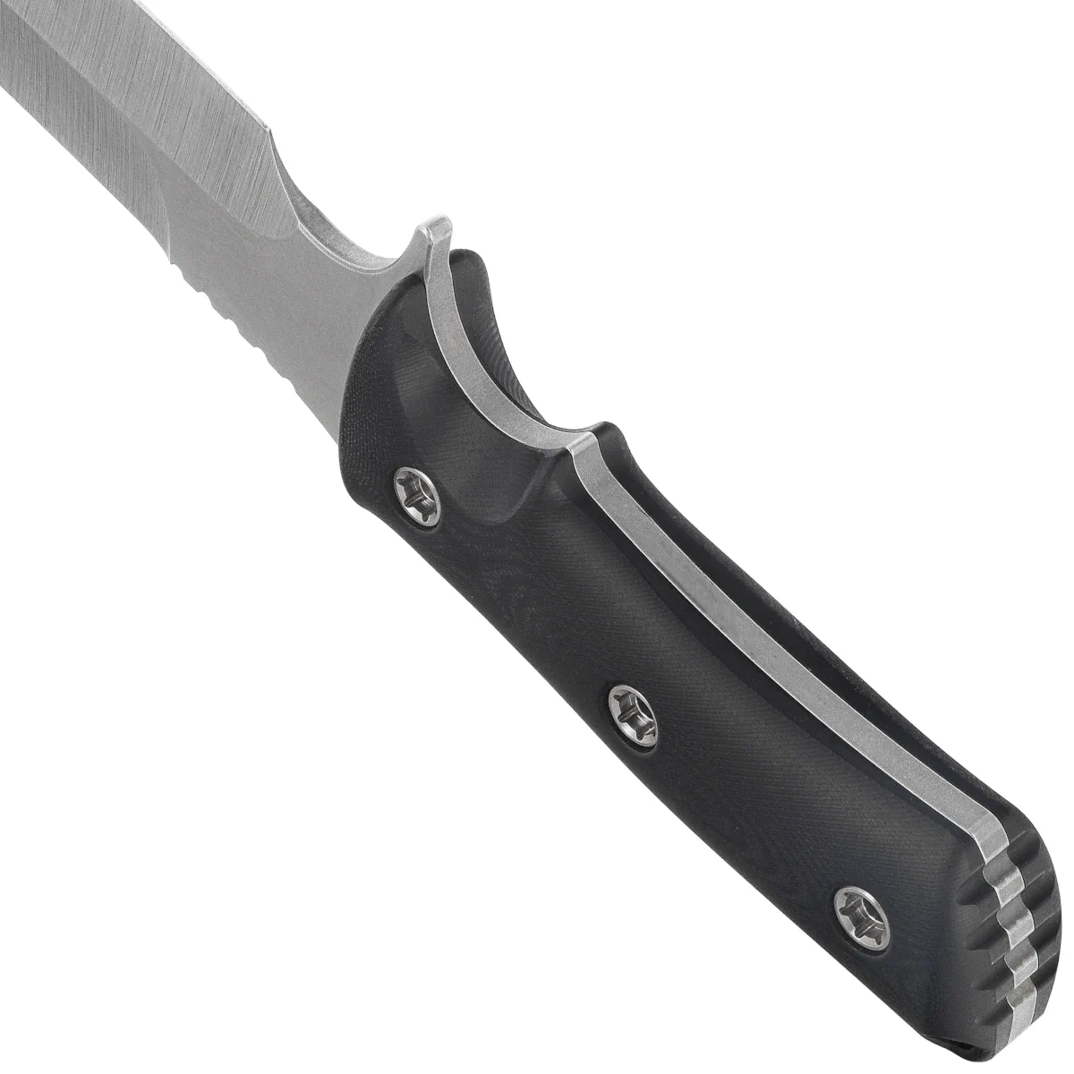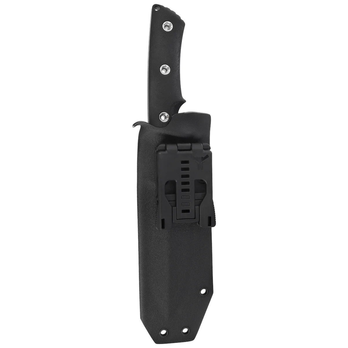 Handle - made of black G10 provides excellent resistance to weather and mechanical damage. Its milled surface and ergonomic shape allow a secure grip in all conditions - regardless of whether the user has wet hands or wears gloves. Three screws solidly fasten the grips to the mandrel, eliminating any play. In the back of the Handle there is a hole for a rope, allowing to secure the knife during field operations. The whole is complemented by a plastic sheath with Tek-Lok mounting, guaranteeing quick access and stable attachment.
