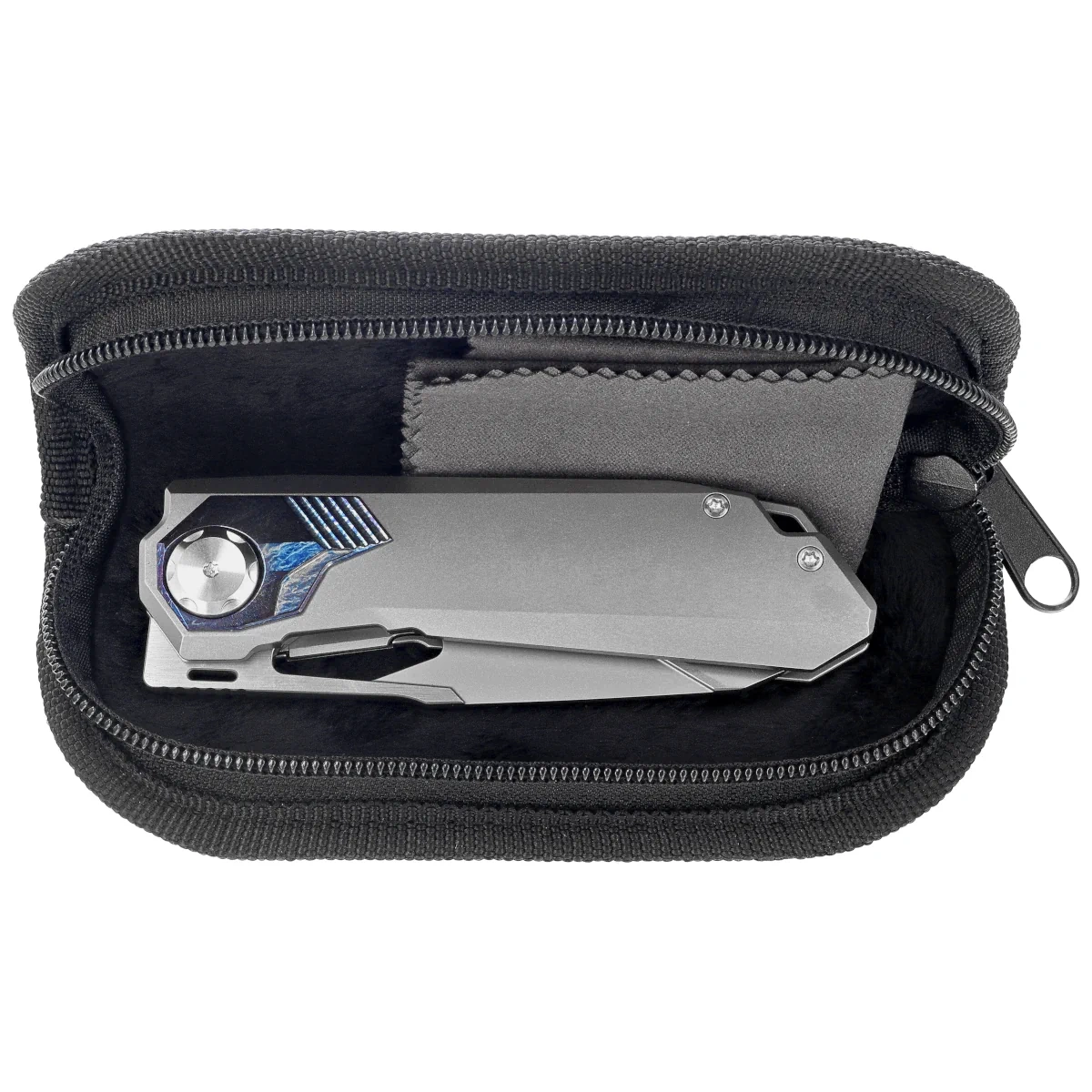 Peregrine Falcon Gray / Thunder Lightning Titanium, Hand Grinding Pearlescent, an exceptional EDC folder that combines excellent functionality with unique style. Hand-ground reverse tanto blade with pearlescent sheen. Front Flipper quick flipper that allows you to instantly open the knife with one hand, it can also be opened with a hole in the blade. This is especially useful in situations where every second counts. The lightweight and durable titanium Handle adds both elegance and resilience. Equipped with an innovative and intuitive Button Liner Lock, which allows you to safely fold the knife while keeping your fingers away from the blade. This version features an additional lock to prevent accidental opening or closing of the knife. The Remette Peregrine Falcon is more than just a tool - it's a statement of personal style and passion. Its compact size makes it easily fit in any pocket, and its quality workmanship and unique design are sure to attract attention.