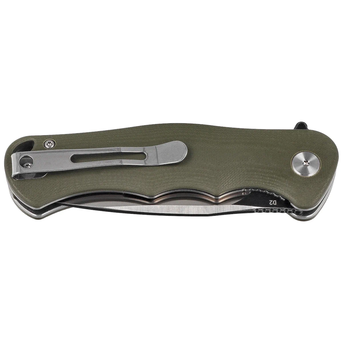 Handle - grips made of G10 composite , a practically indestructible material insensitive to weather conditions, resistant to chemicals and mechanical damage Chamfered edges of the covers eliminate sharp edges and textured surface improves grip security. The solid backspacer to which the grips are attached guarantees the rigidity and strength of the entire structure. A single-position, right-handed clip allows the knife to be carried in tip-up position , with the tip of the blade upward. Above the clip an enlarged hole for threading a safety or decorative cord.