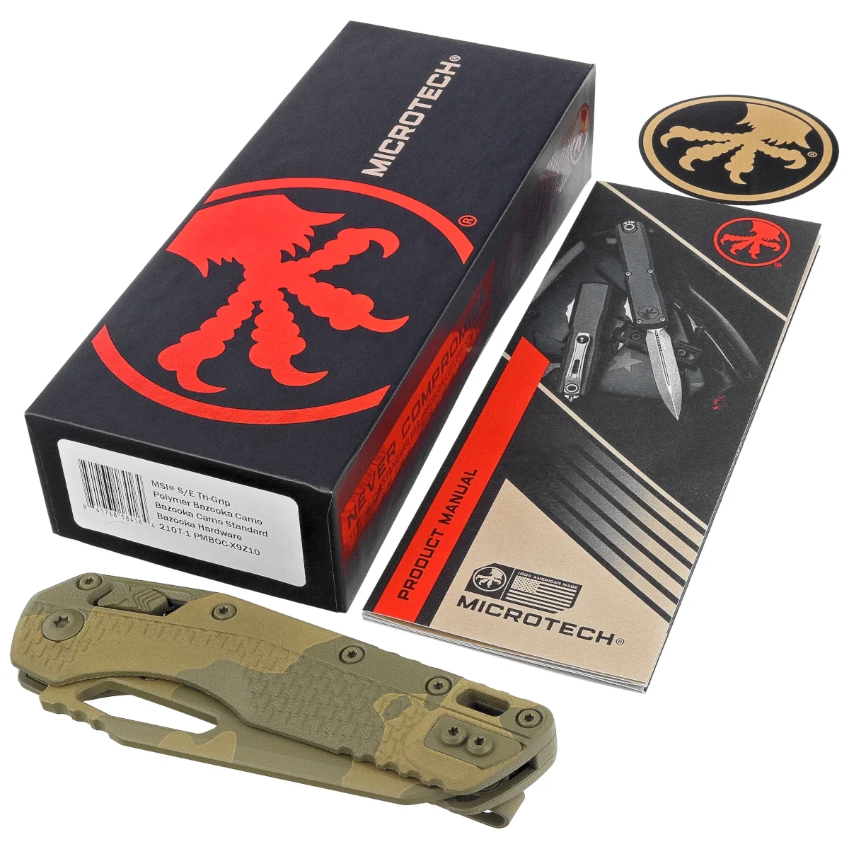 MSI S/E Ram-Lok Bazooka Camo Tri-Grip Polymer, Bazooka Camo folding knife that combines strength, durability and elegance. Its blade is made of excellent M390MK steel, which is the result of cooperation between two renowned companies - Microtech and Böhler. This steel is known for its exceptional strength and long sharpness retention, making this knife unafraid of any challenge. The intuitive RAM-Lok ensures safety during use. This innovative lock is easy to operate and provides ease of use for both right and left-handed people. The Handle of the knife is made of polymer, durable and ergonomic. Its shape is designed to fit perfectly in the hand, ensuring comfort even during prolonged use. This knife is not only a tool, but also a work of applied art. Its designer, Anthony Marfione, founder and owner of Microtech, has taken care of every detail. From the elegant black finish to the satin details, this knife is both beautiful and practical. Whether you're looking for a reliable tool or an elegant accessory, MSI (Microtech Standard Issue) knife will meet your needs.