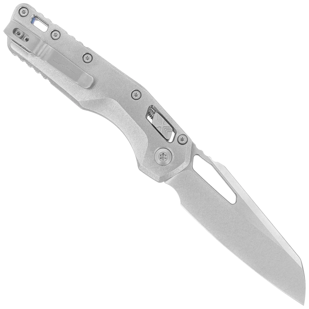 Handle - made with excellent precision in 3D technology on CNC milling machines from durable titanium, for better grip also finished with Stonewashed method. Wide locking slide with Microtech's characteristic stepped X structure . Both grips are bolted together with a solid titanium backspacer. A double-sided (right/left) clip allows the knife to be carried discreetly in tip-up position. Above the clip a lanyard hole, a place for a safety or decorative cord.