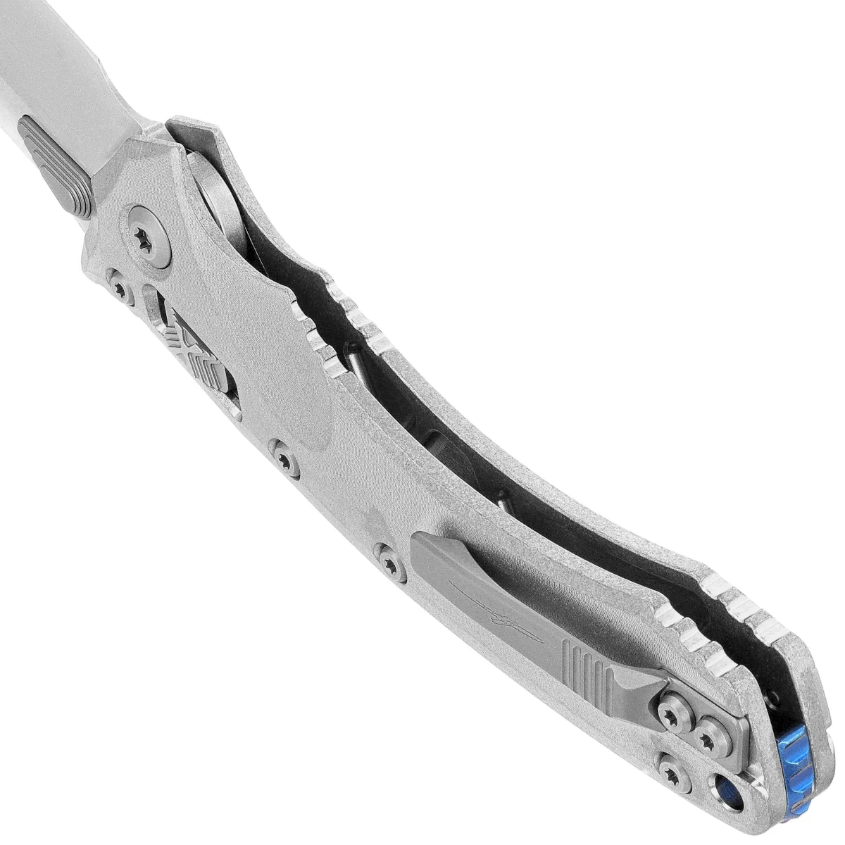 Handle - made of durable titanium, Stonewashed finish for better grip . Wide locking slide with Microtech's characteristic stepped X structure . Both grips are bolted together with a solid titanium backspacer in blue. A double-sided (right/left) titanium clip allows the knife to be carried discreetly in tip-up position. Above the clip a lanyard hole, a place for a safety or decorative cord.