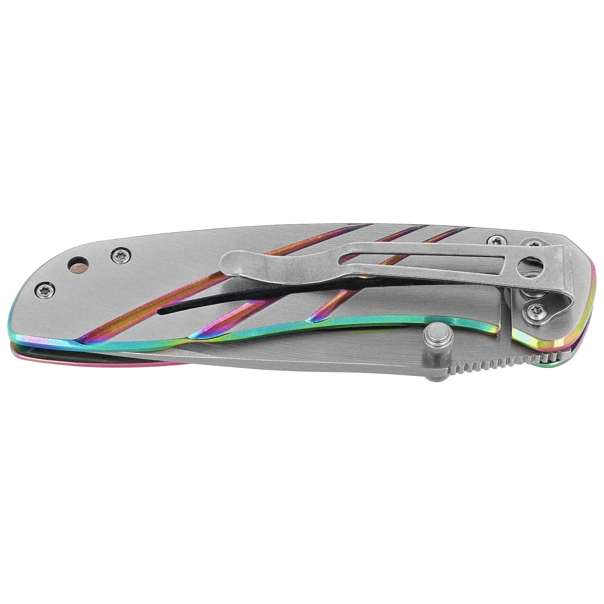 Handle - coated with Titanium Coated is distinguished by a rainbow iridescent effect, which gives the knife a futuristic look. Profiled notches in the surface perform an anti-slip function, improving control over the tool while working. The attachment clip allows for quick and stable mounting to a belt or pocket edge, increasing everyday functionality. The design of the Handle itself is resistant to mechanical wear, and its form has been refined to ensure ergonomics and comfort also during prolonged use. This is an offer for people who in a knife are looking not only for a tool, but also for a distinctive styling element.