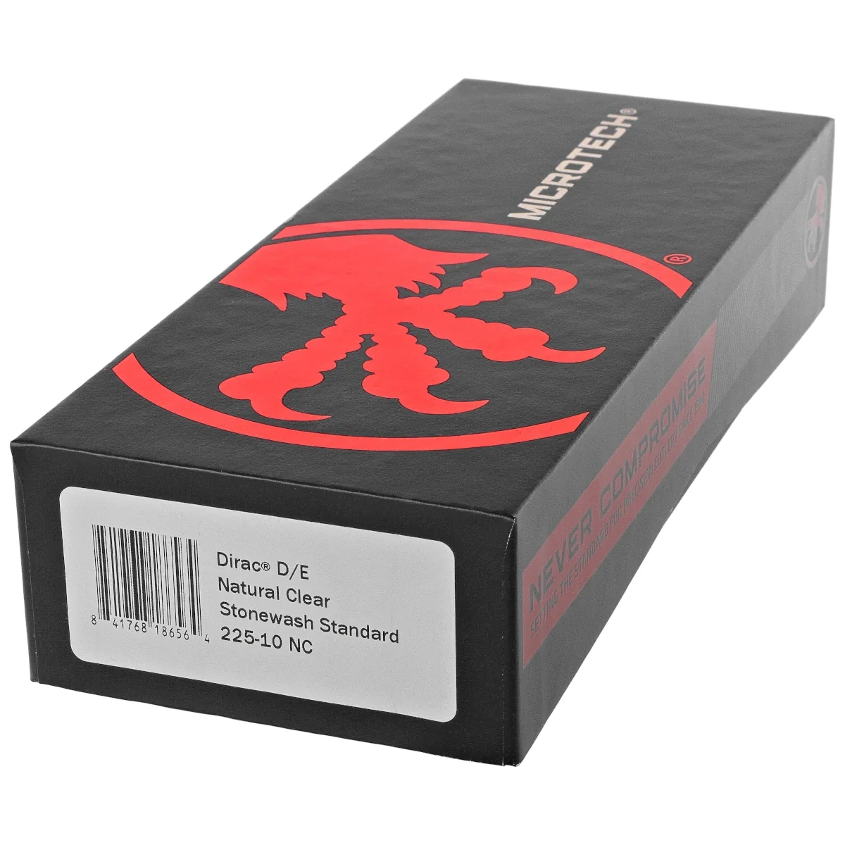 • Dirac D/E Natural Clear Aluminum, Stonewashed is compact OTF knife with a double action (D/A) mechanism. It features a quick blade release mechanism. Side slider ensures comfortable and intuitive operation. Designed by Tony Marfione from Microtech Knives.