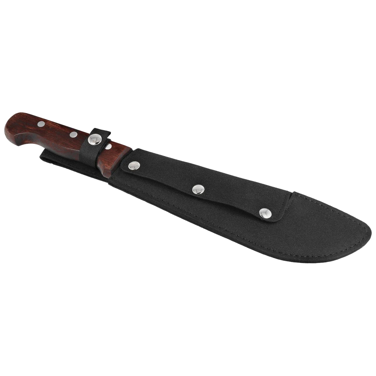 Handle - made of dark, natural wood, combining a classic look with good ergonomics. Anatomical profiling of the handle allows you to operate the tool comfortably for a long time, reducing hand fatigue. The stable riveted attachment to the full tang shaft translates into the durability of the whole and resistance to overloading. On the back there is a slight widening, which improves safety and prevents accidental slipping of the machete during work. The included nylon sheath allows for convenient carrying and storage of the tool, increasing its functionality in field conditions.