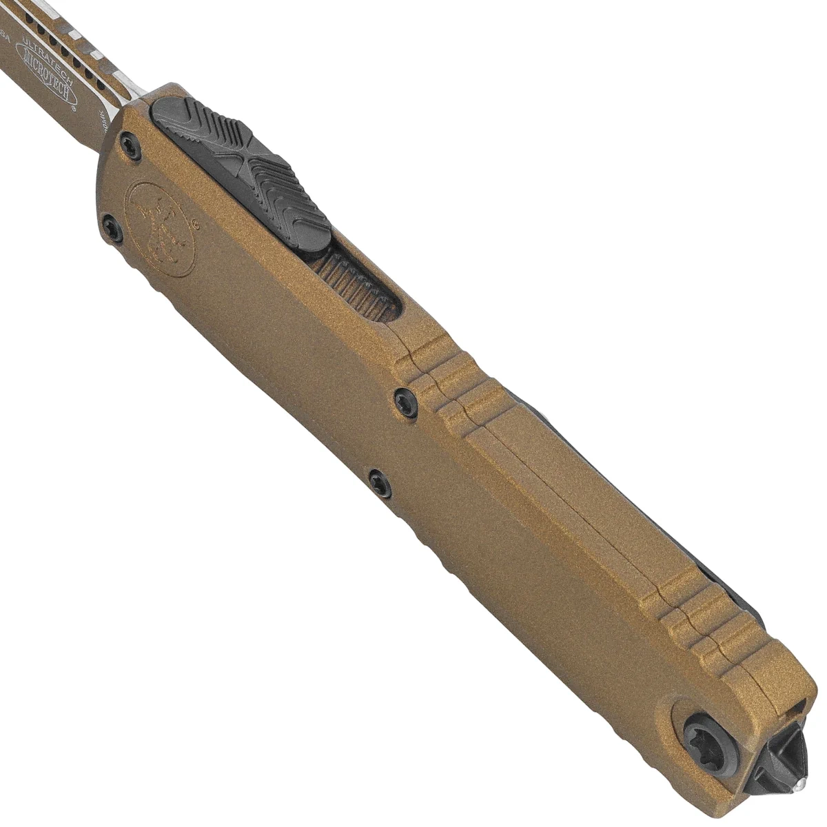 Ultratech S/E Gen III ZBP Cerakote Burnt Bronze Aluminum, Cerakote Burnt Bronze is a new addition to the Ultratech series - Microtech's first OTF knife without any blade play when unfolded! The blade play free automatic is distinguished by a number of improvements such as; Crud Kutter™, Dual-Fuel Drive Train™, Zero Blade Play™. The Handle was also redesigned, equipping it with solutions known from other models. Working in D/A (Double Action) mode, it allows the blade to be instantly extended and retracted with a single thumb movement. The design by Tony Marfione, owner of Microtech Knives, combines modern design with the highest quality workmanship