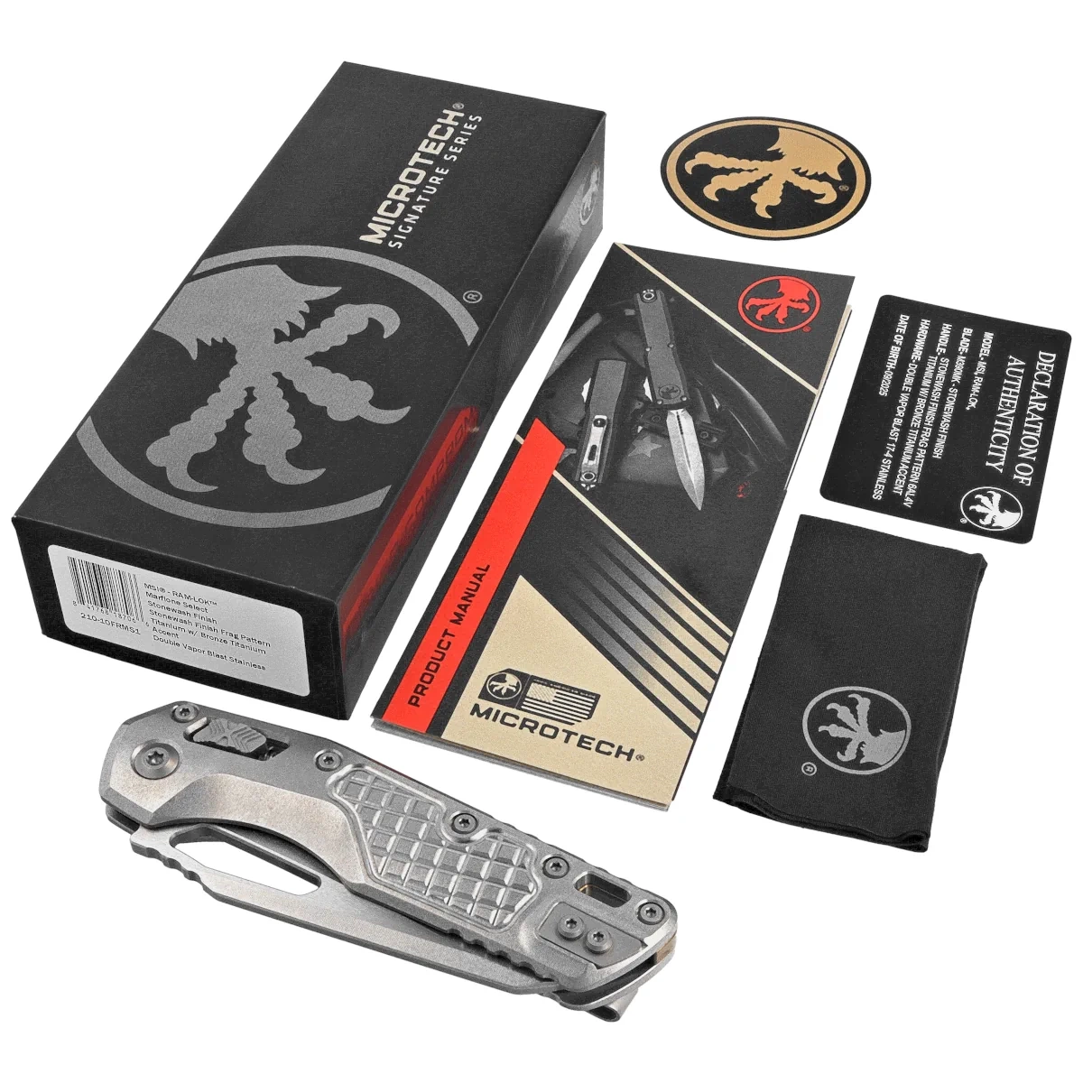 • Marfione Select MSI S/E Frag Titanium, Bronze HW, Stonewashed strong folding knife with intuitive RAM-Lock. Superior M390MK blade steel, the result of collaboration between Microtech and Bohler engineers. Ergonomic and durable titanium handle.