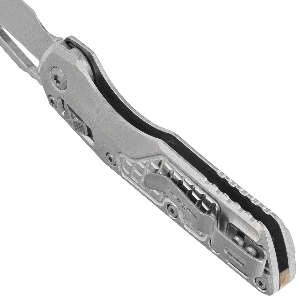 Handle - made with excellent precision in 3D technology on CNC milling machines from durable titanium, for better grip covered with a characteristic texture imitating the surface of a fragmentation grenade(Frag Pattern). Wide locking slide with Microtech's characteristic stepped X structure . Both facings are bolted together with a solid titanium backspacer. A double-sided (right/left) clip allows the knife to be carried discreetly in tip-up position. Above the clip a lanyard hole, a place for a safety or decorative cord.